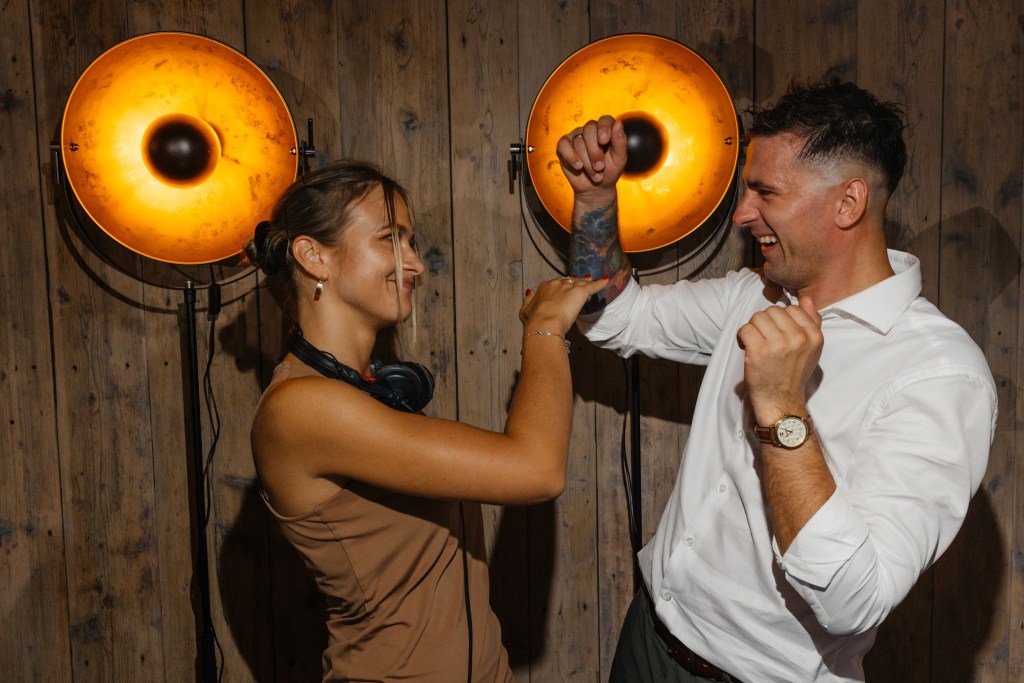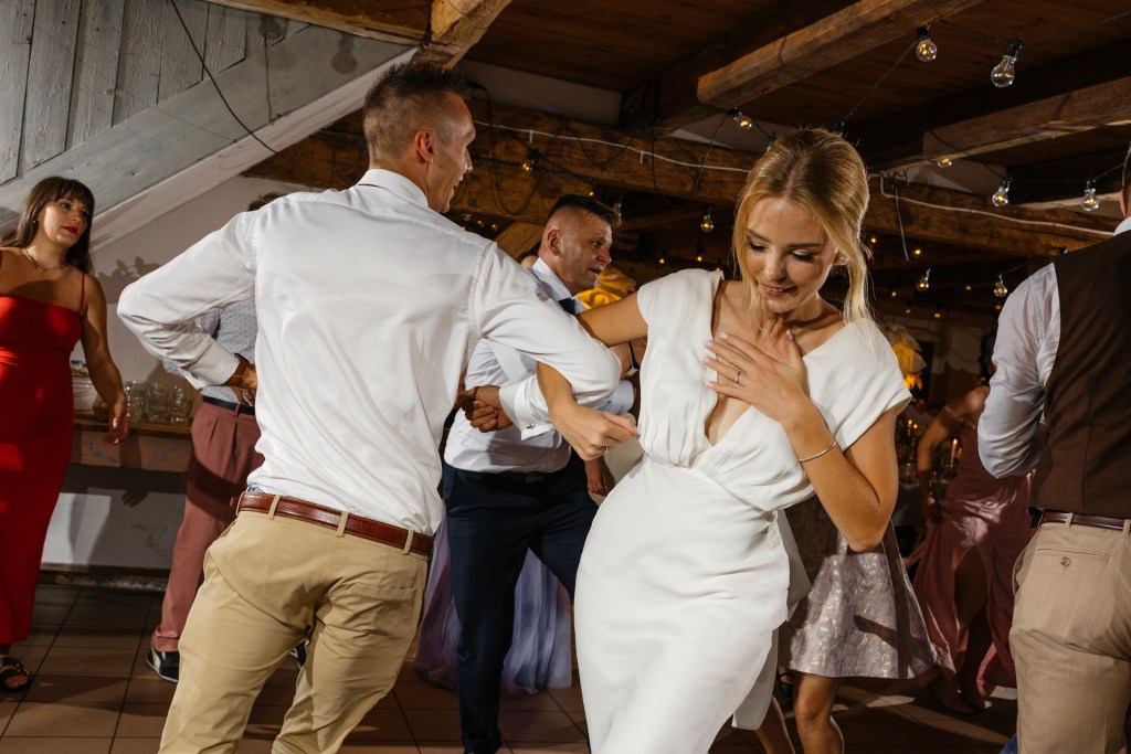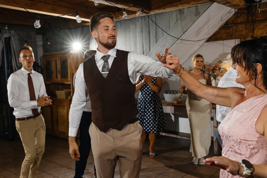 Jednym z najpiękniejszych momentów była sesja z mustangiem — odważna, filmowa i pełna dynamiki. A wieczorem, kiedy spadł deszcz, nie zatrzymaliśmy się ani na chwilę. Powstała magiczna sesja z parasolkami, którą zakończyliśmy tuż przed wejściem do Kotulińskiego 6, wykorzystując odbicia świateł i mokre podłoże. Na parkiecie trwała szalona zabawa, którą nakręcała charyzmatyczna DJ-ka — energia, która doskonale oddaje ducha tego miejsca.