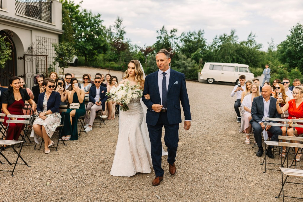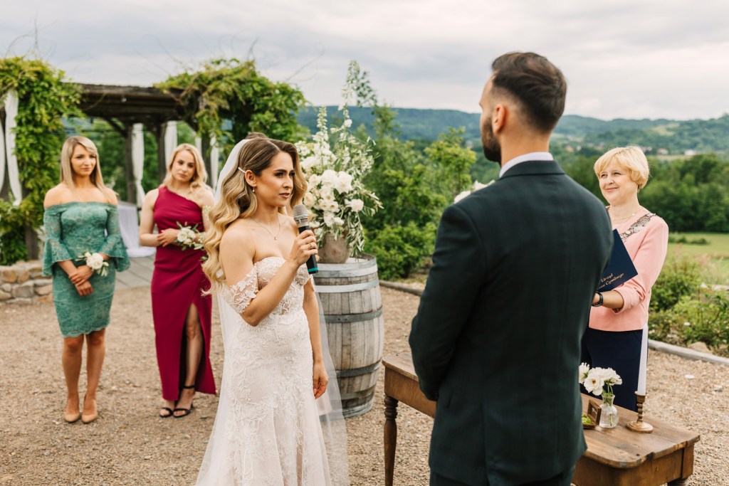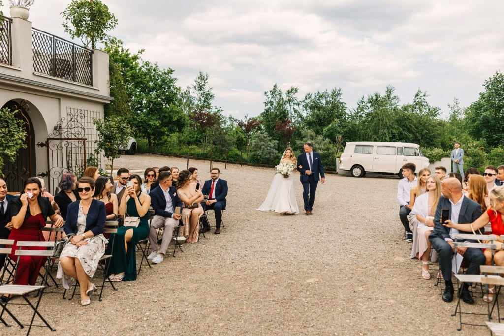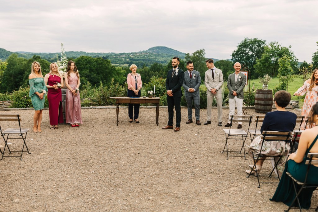 Razem z gośćmi zgromadziliśmy się w przygotowanym na ceremonię miejscu, które przez swoją surowość jeszcze bardziej podkreślała ciepło, bijące od Lidii i Kamila. I tutaj państwo młodzi wpisali się w dominujący ostatnio trend: zdecydowali się bowiem na ceremonię cywilną, którą poprowadziła przemiła Pani Urzędnik z Lanckorony. Gdy po chwili, już jako mąż i żona, opuszczali miejsce, gdzie odbyła się ceremonia, całe to miejsce wypełniły, rzucane przez gości, płatki świeżych kwiatów. Ależ to był piękny widok!