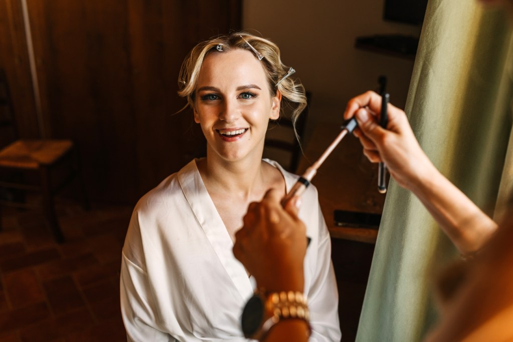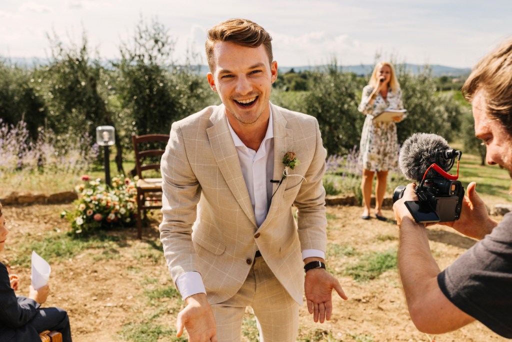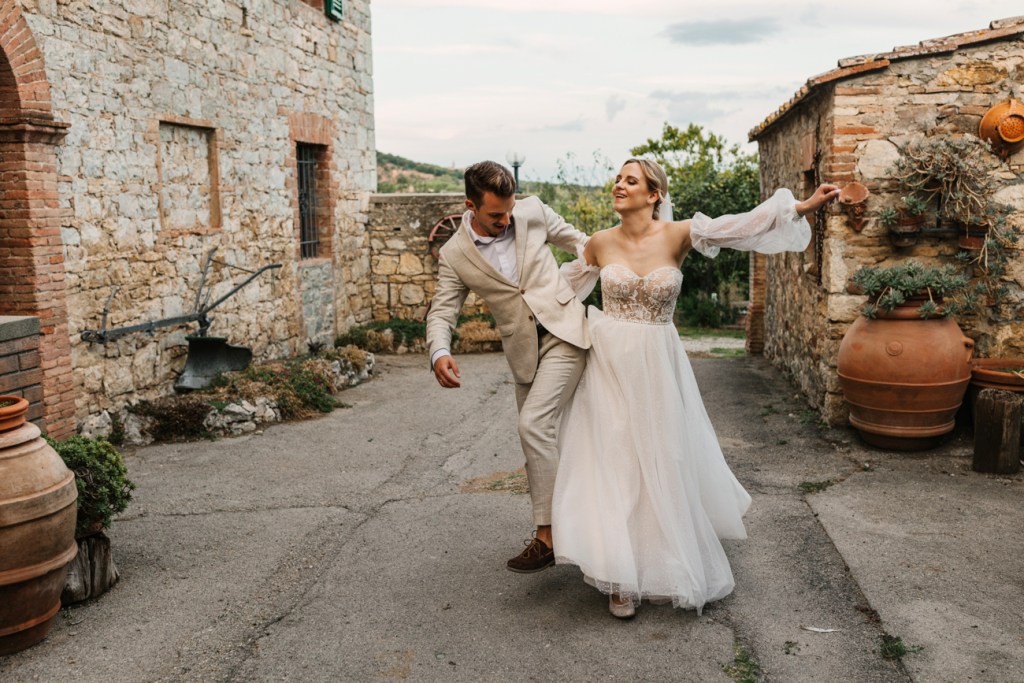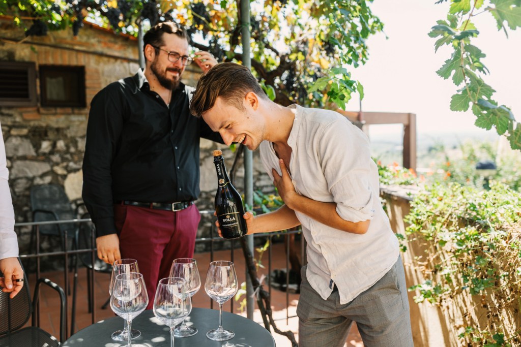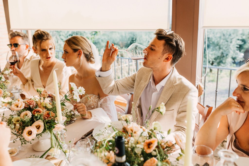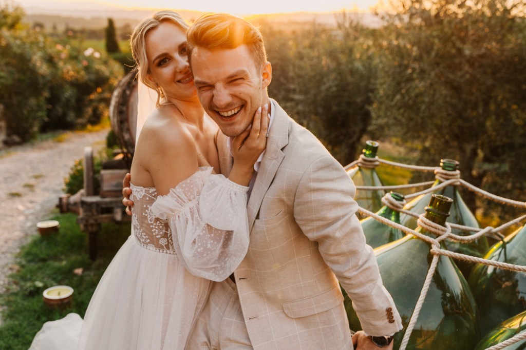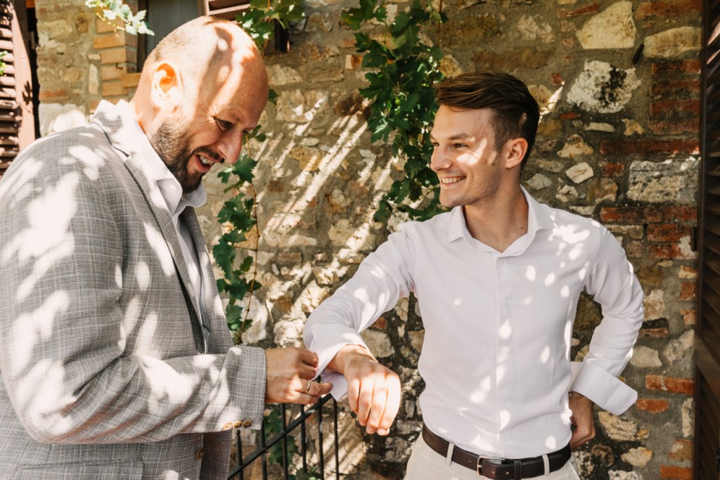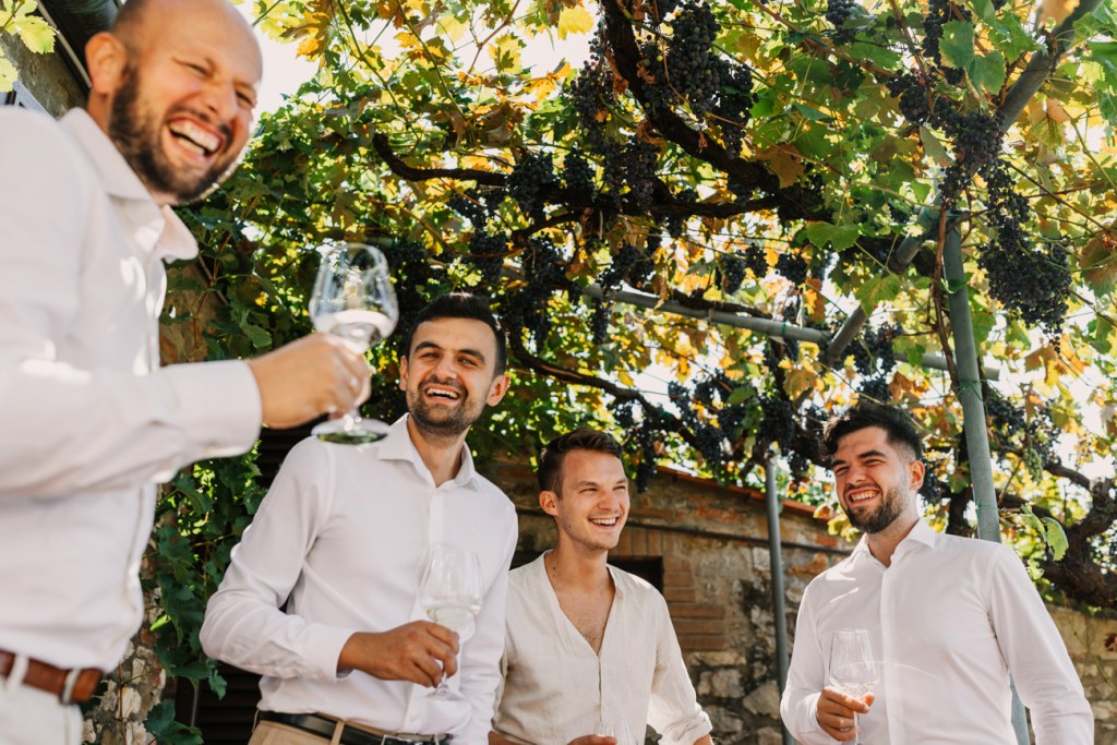 Całe przyjęcia wraz z przygotowaniami odbywały się w ceglanej wilii, z widokiem na niekończące się alejki z krzewami winogron, od którego naprawdę można się uzależnić. Poza naszą winnicą, niedaleko znajdowały się jeszcze tylko dwie restauracje oznaczone gwiazdkami Michelin… i tyle. Sama przyroda i my. To wszystko sprawiło, że goście na miejscu bardzo szybko weszli w tryb włoskiego dolce vita. Dominika ze swoją świadkową i lampką wina, w doskonałych humorach przygotowywały się do ceremonii. W drugiej części domu, w tym samym czasie do ślubu, w towarzystwie swoich przyjaciół, przygotowywał się Marek. Nikt ani przez chwilę nie stresował się tym, co miało za chwilę się wydarzyć. I ten dobry humor nie opuszczał już Dominiki i Marka ani przez chwilę trwania ich ślubu w Toskanii.