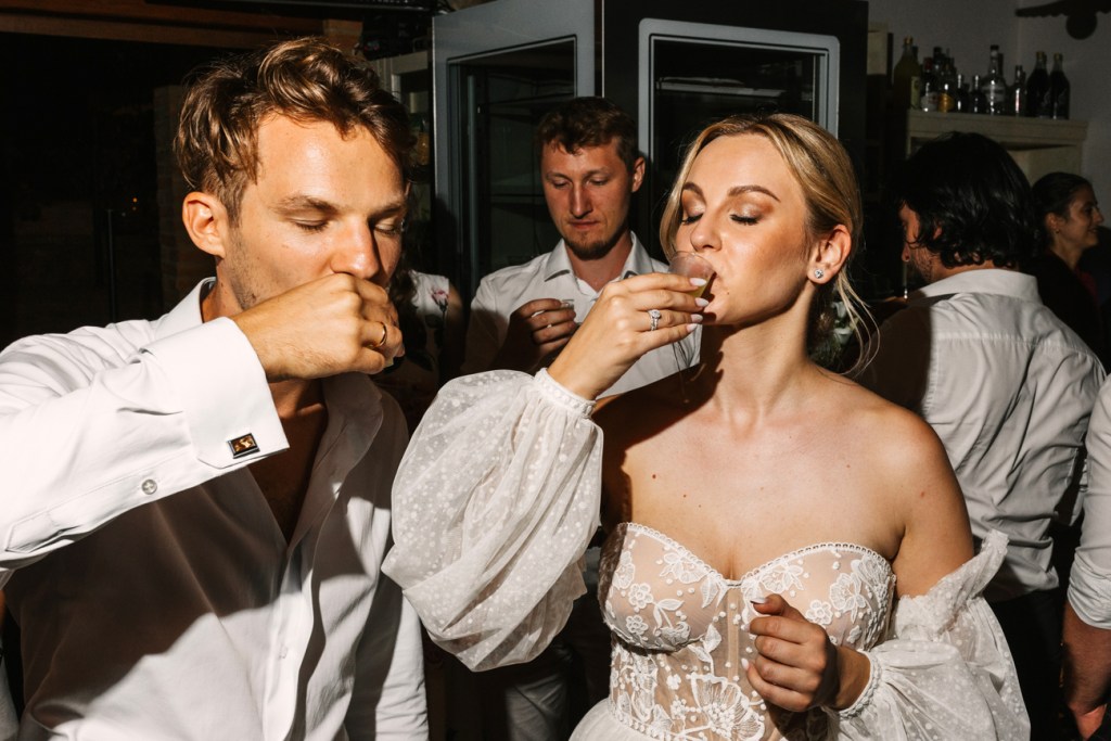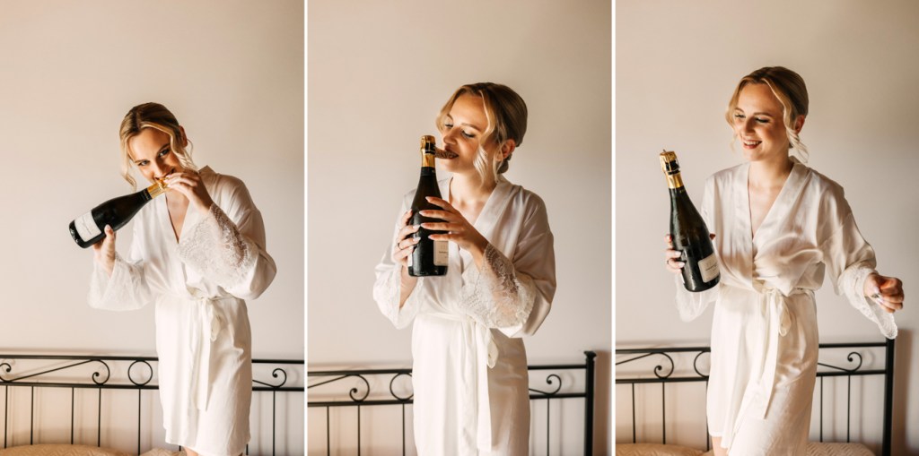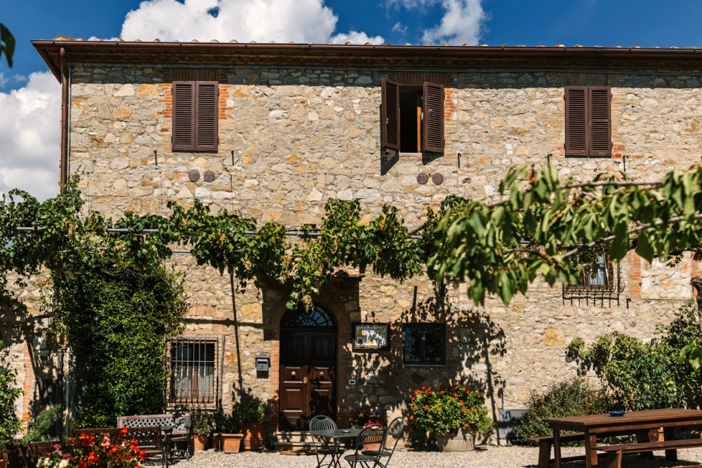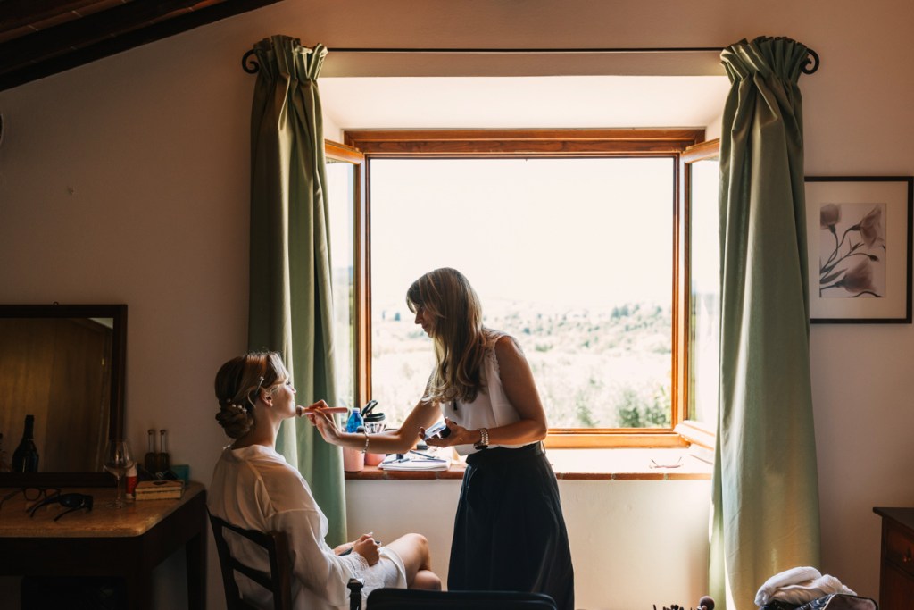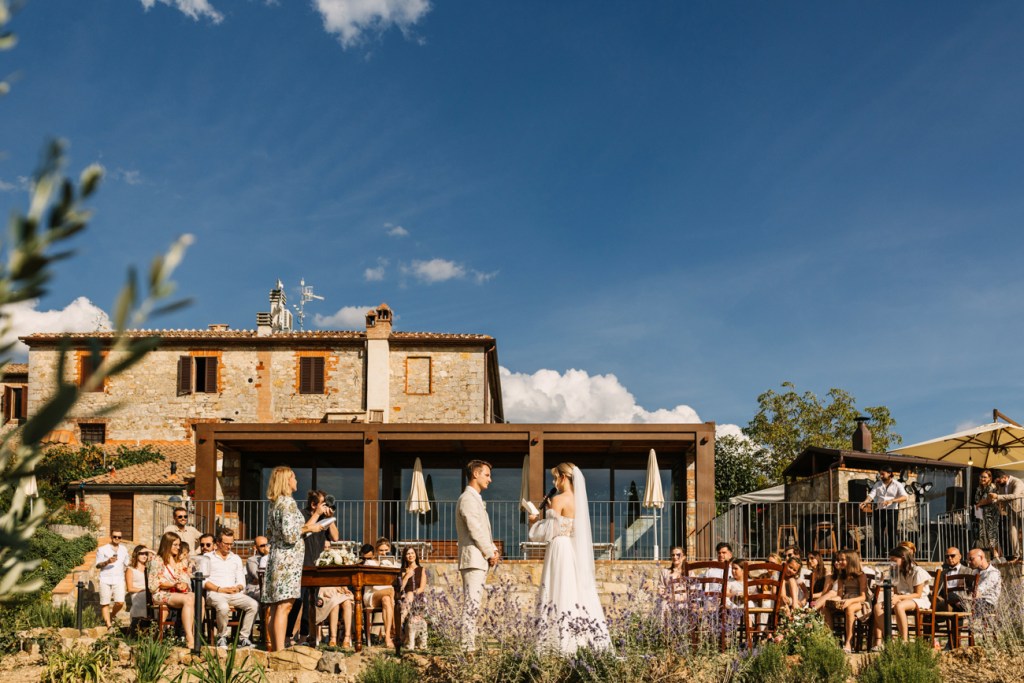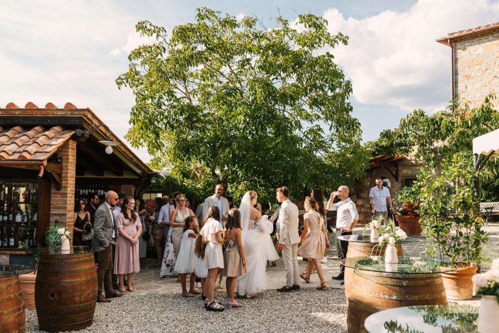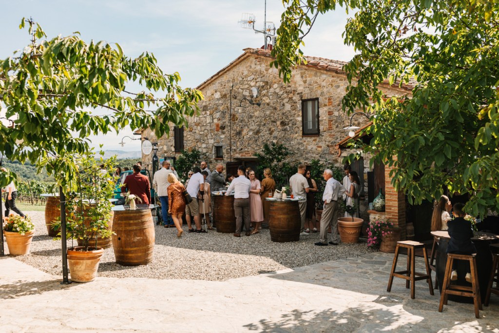 Całe przyjęcia wraz z przygotowaniami odbywały się w ceglanej wilii, z widokiem na niekończące się alejki z krzewami winogron, od którego naprawdę można się uzależnić. Poza naszą winnicą, niedaleko znajdowały się jeszcze tylko dwie restauracje oznaczone gwiazdkami Michelin… i tyle. Sama przyroda i my. To wszystko sprawiło, że goście na miejscu bardzo szybko weszli w tryb włoskiego dolce vita. Dominika ze swoją świadkową i lampką wina, w doskonałych humorach przygotowywały się do ceremonii. W drugiej części domu, w tym samym czasie do ślubu, w towarzystwie swoich przyjaciół, przygotowywał się Marek. Nikt ani przez chwilę nie stresował się tym, co miało za chwilę się wydarzyć. I ten dobry humor nie opuszczał już Dominiki i Marka ani przez chwilę trwania ich ślubu w Toskanii.