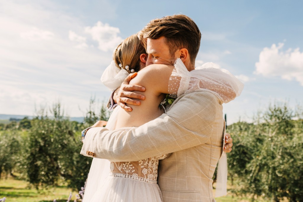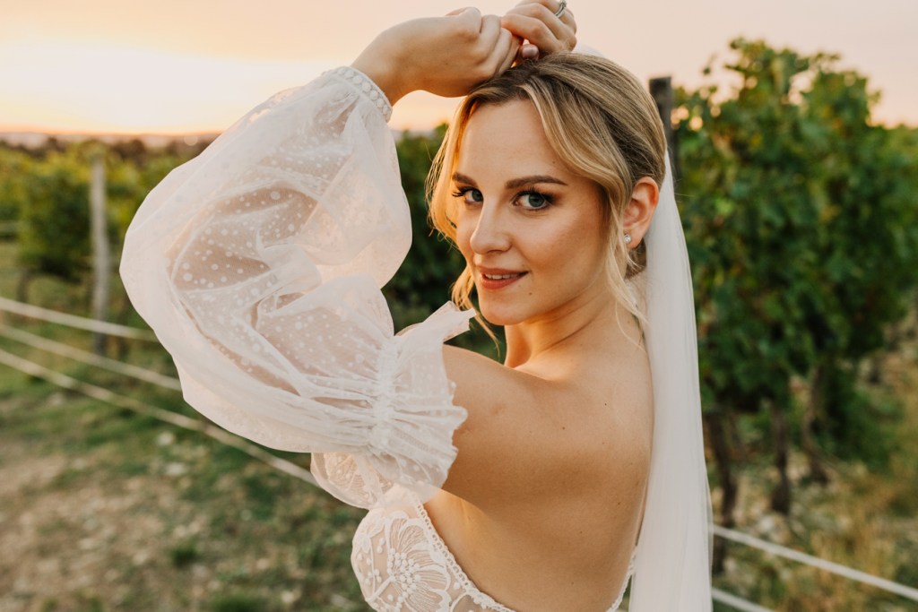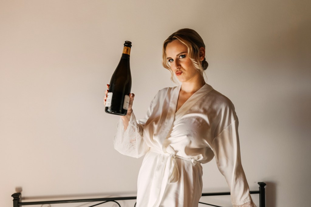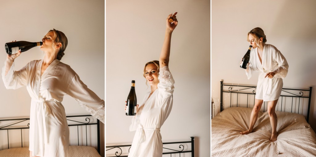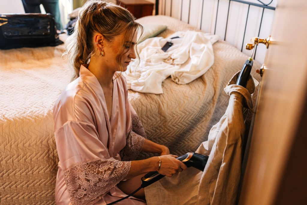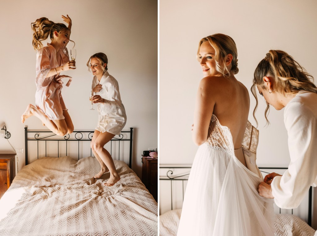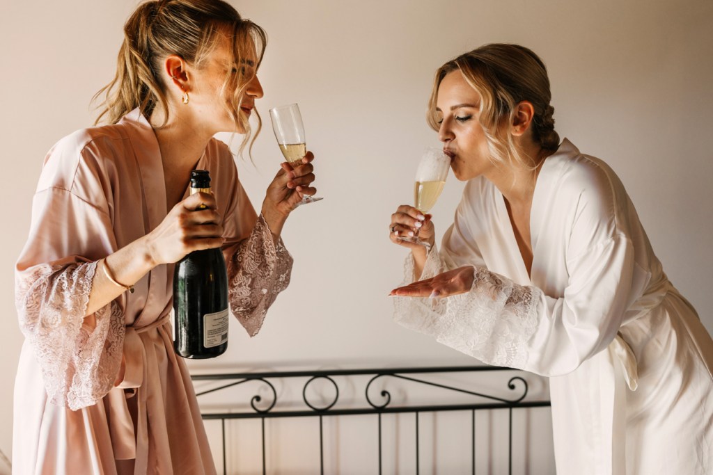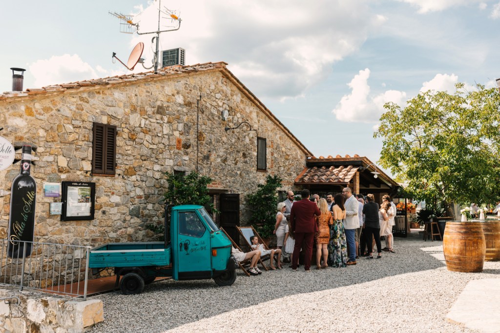 Całe przyjęcia wraz z przygotowaniami odbywały się w ceglanej wilii, z widokiem na niekończące się alejki z krzewami winogron, od którego naprawdę można się uzależnić. Poza naszą winnicą, niedaleko znajdowały się jeszcze tylko dwie restauracje oznaczone gwiazdkami Michelin… i tyle. Sama przyroda i my. To wszystko sprawiło, że goście na miejscu bardzo szybko weszli w tryb włoskiego dolce vita. Dominika ze swoją świadkową i lampką wina, w doskonałych humorach przygotowywały się do ceremonii. W drugiej części domu, w tym samym czasie do ślubu, w towarzystwie swoich przyjaciół, przygotowywał się Marek. Nikt ani przez chwilę nie stresował się tym, co miało za chwilę się wydarzyć. I ten dobry humor nie opuszczał już Dominiki i Marka ani przez chwilę trwania ich ślubu w Toskanii.