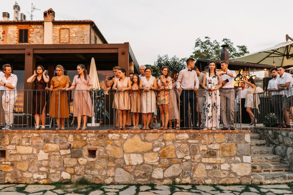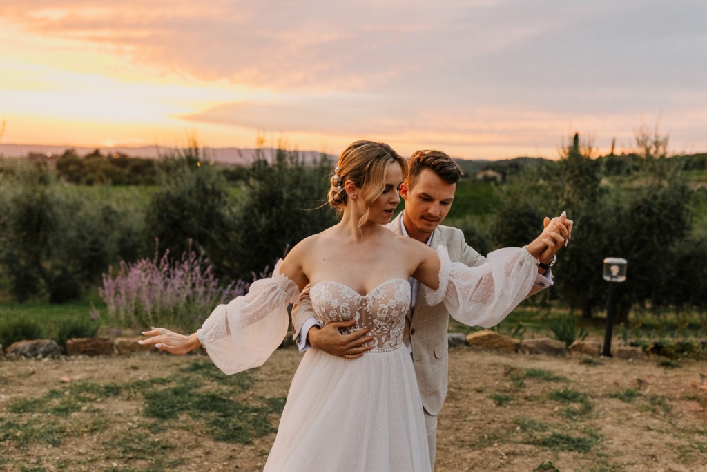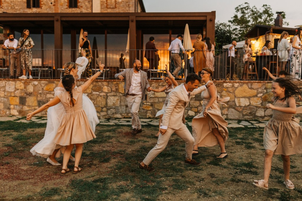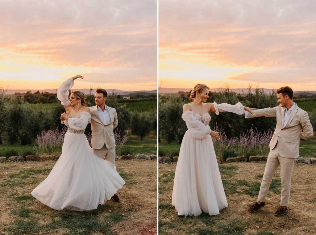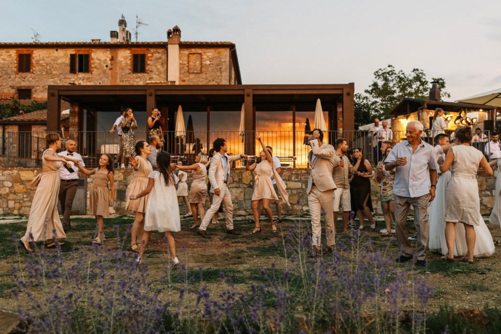 Nie wiem, czy mieliście kiedyś okazję widzieć zachód w Toskanii, ale jest w nim coś niezwykłego. Różowa poświata, która powoli wypełnia całe niebo, rzucając przy tym ciepło na wszystko dookoła. Te tańczące na niebie, oddziaływujące na siebie wzajemnie kolory, uzupełnił pierwszy taniec młodych, który w takich właśnie okolicznościach miał swoje miejsce. Młodzi, w pełni naturalnie, postanowili zatańczyć swój pierwszy taniec na trawie, ale nie trzeba było długo czekać na to, by dołączyli do nich reszta gości.
