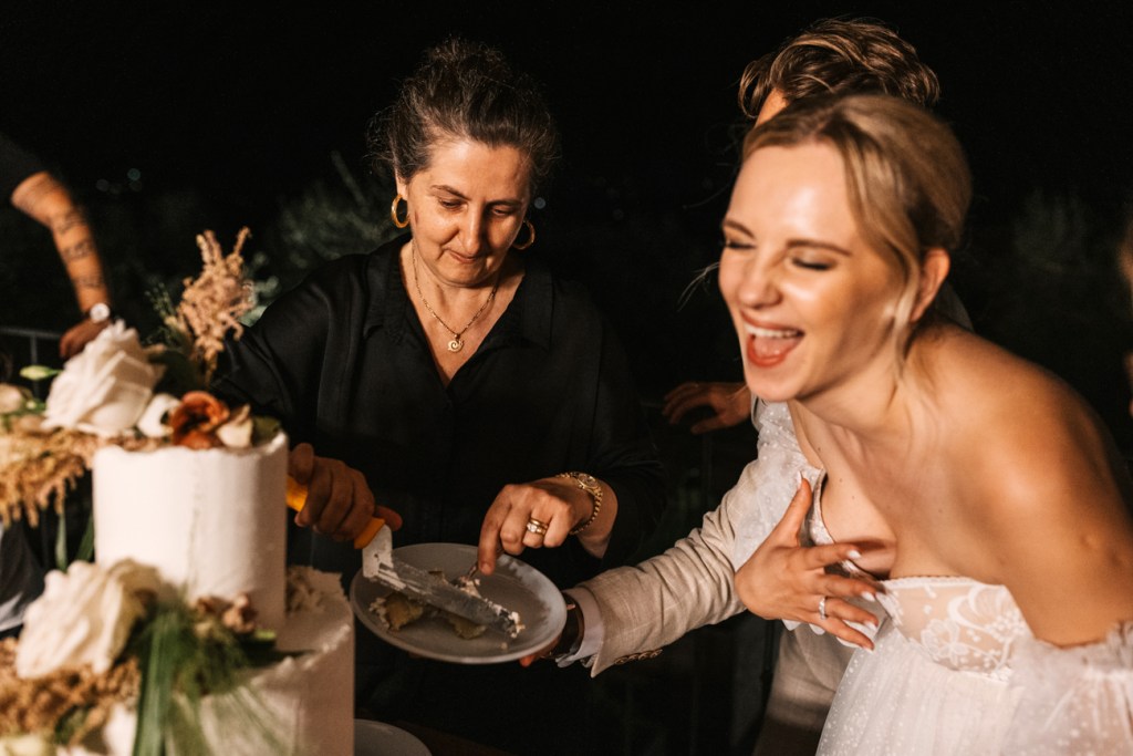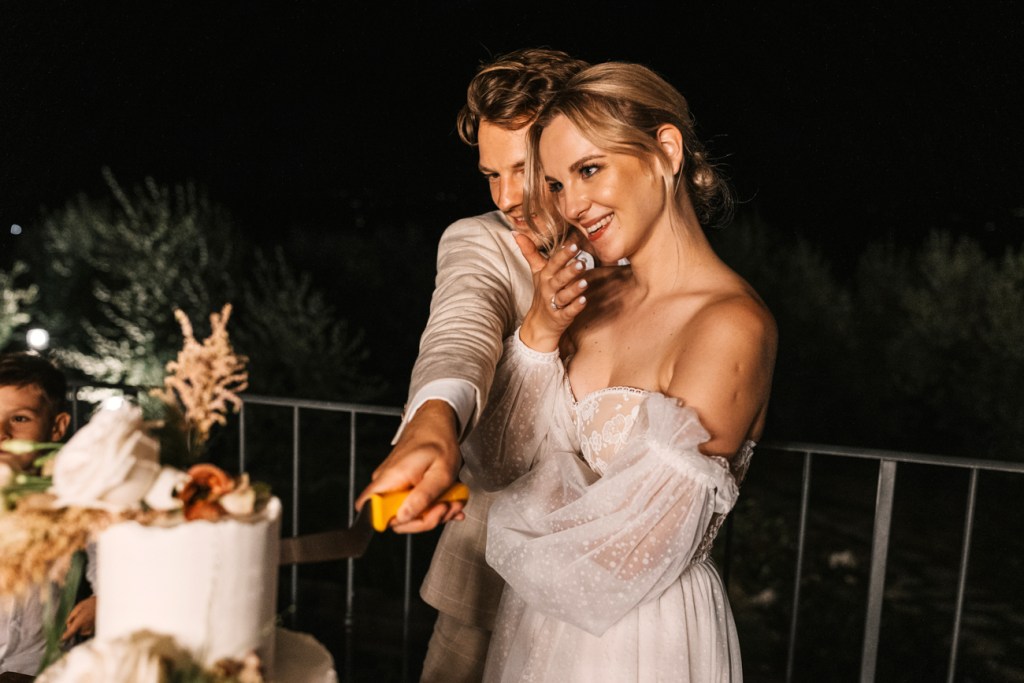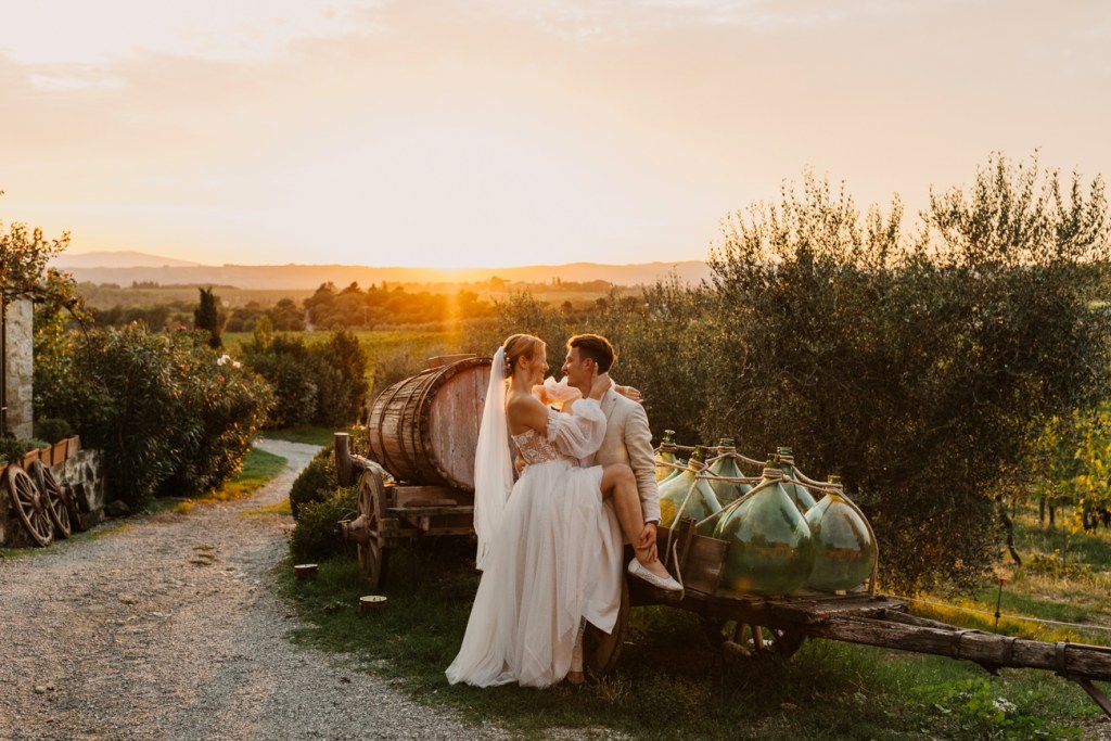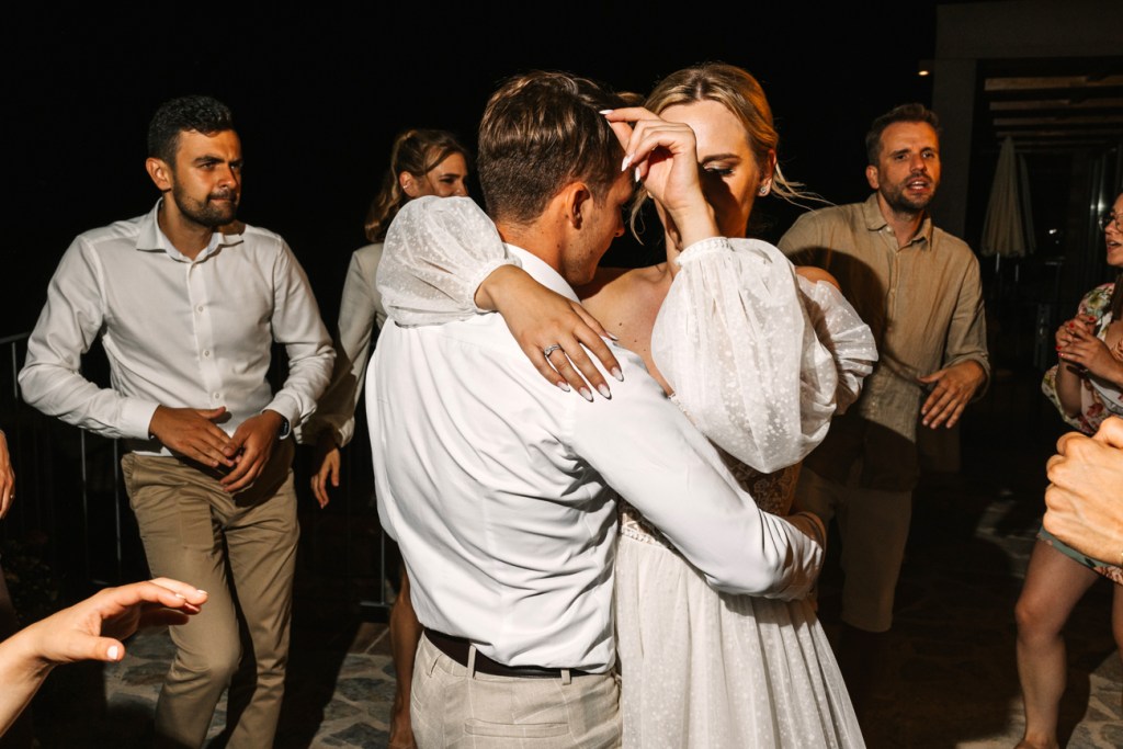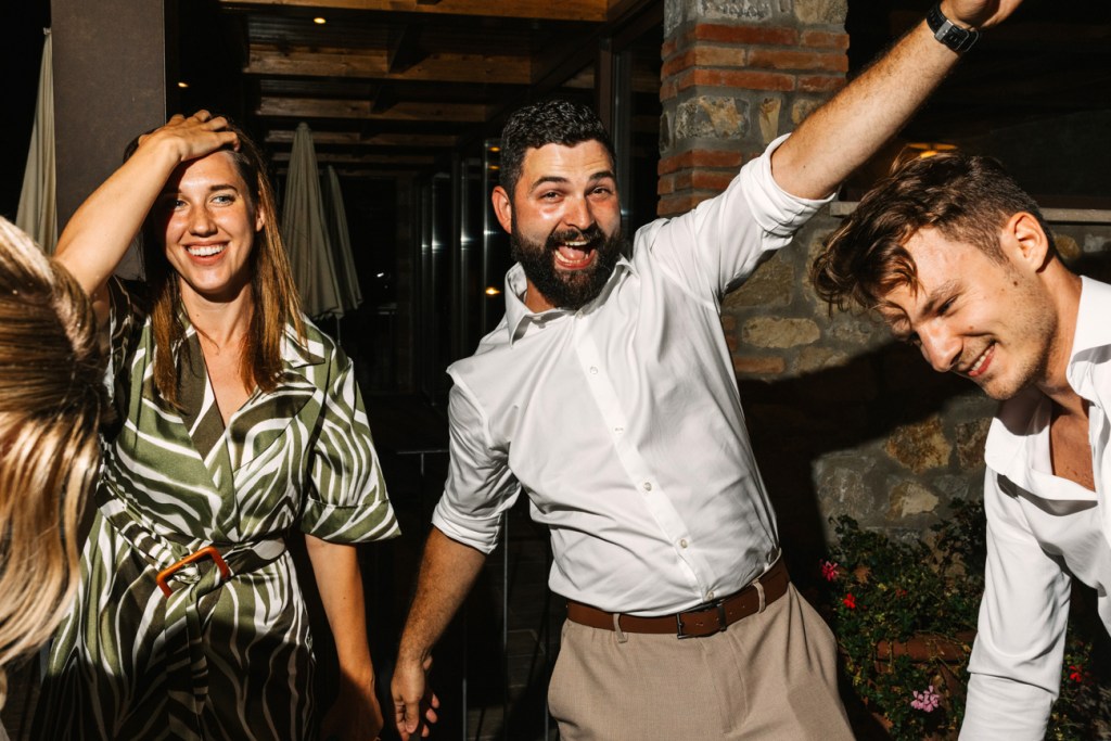 Nie wiem, czy mieliście kiedyś okazję widzieć zachód w Toskanii, ale jest w nim coś niezwykłego. Różowa poświata, która powoli wypełnia całe niebo, rzucając przy tym ciepło na wszystko dookoła. Te tańczące na niebie, oddziaływujące na siebie wzajemnie kolory, uzupełnił pierwszy taniec młodych, który w takich właśnie okolicznościach miał swoje miejsce. Młodzi, w pełni naturalnie, postanowili zatańczyć swój pierwszy taniec na trawie, ale nie trzeba było długo czekać na to, by dołączyli do nich reszta gości.