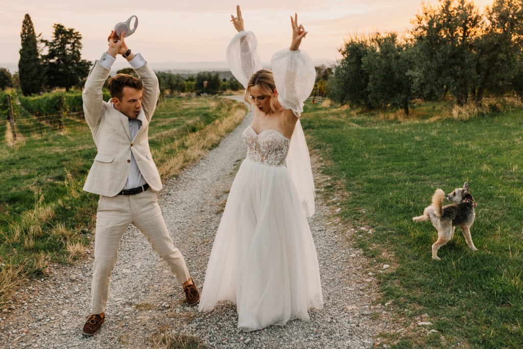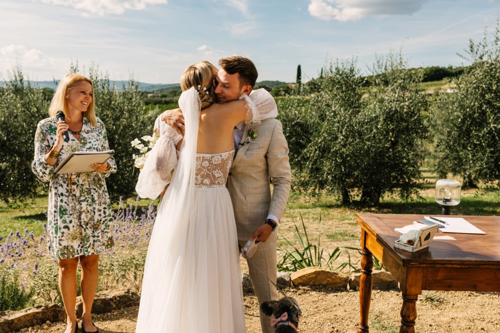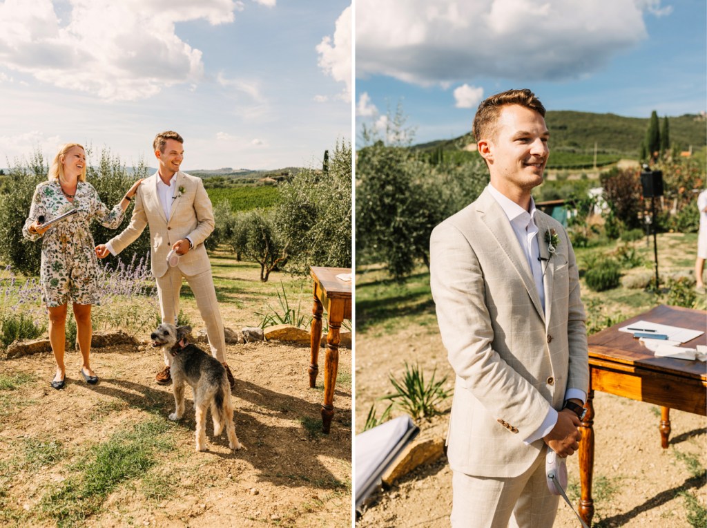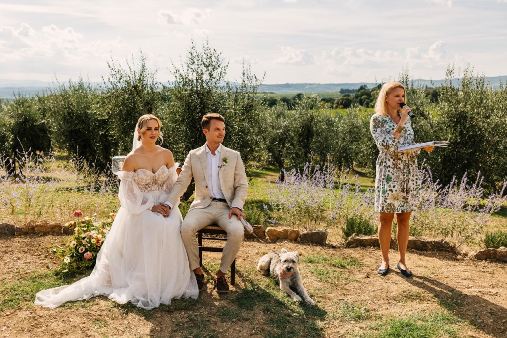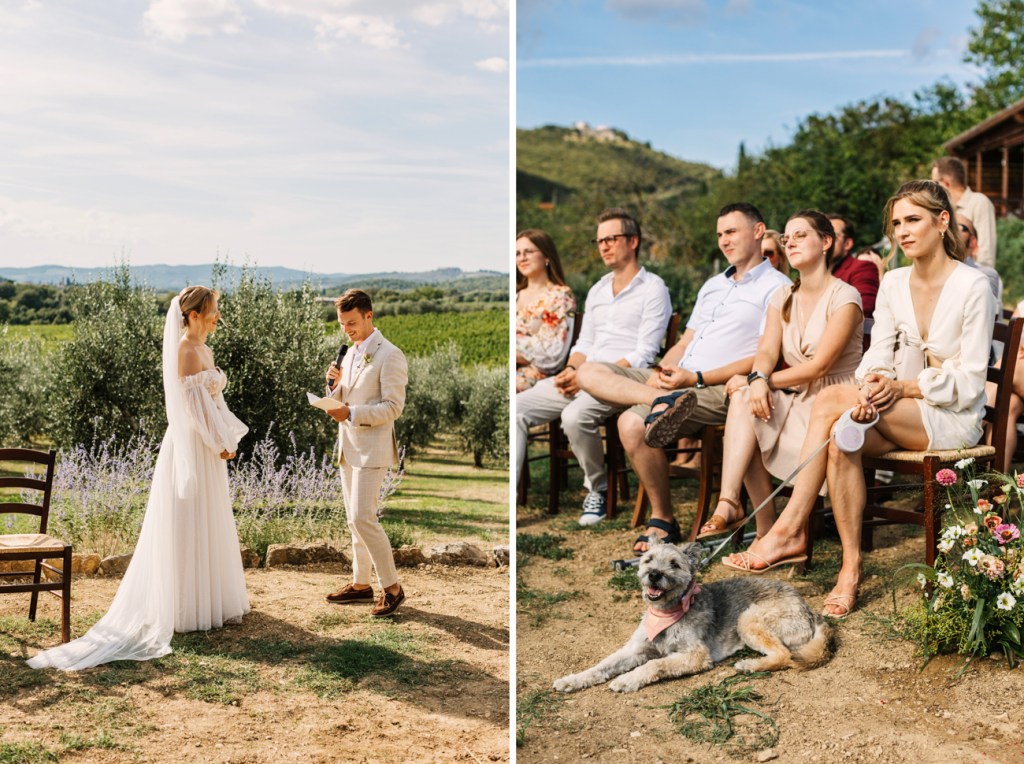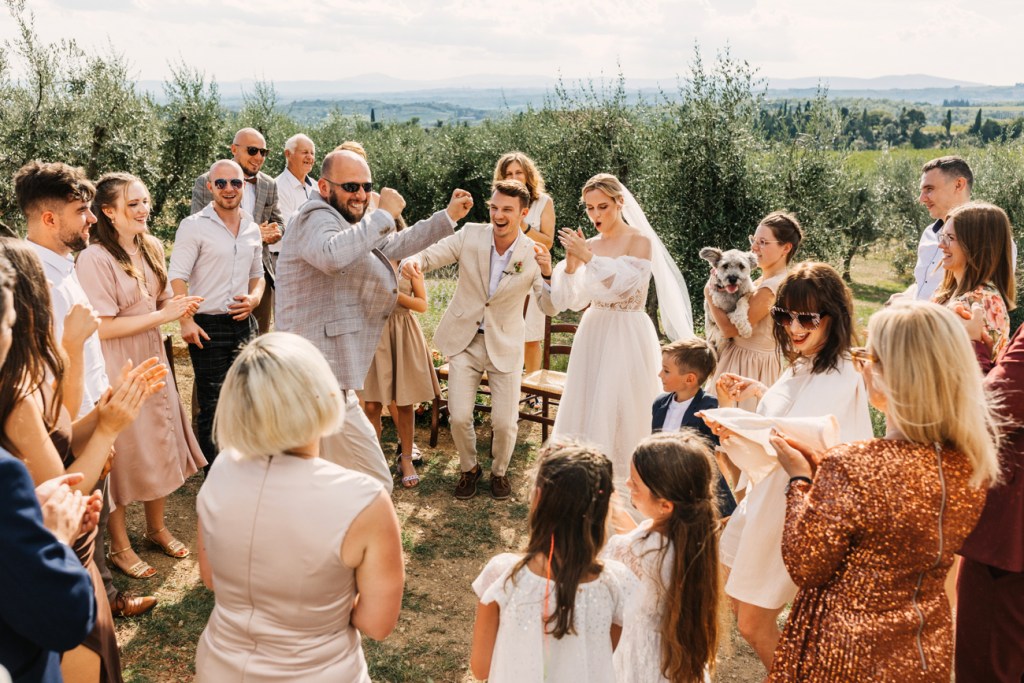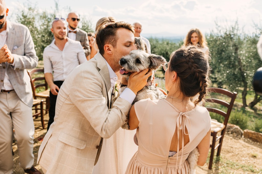 W tym samym czasie, gdy młodzi, przebierali się powoli w swoje ślubne stroje, goście mogli częstować się wybitnie dobrym winem, z którego Toskania słynie oraz próbować kolejnych włoskich regionalnych przysmaków, pod którymi uginały się stoły. A później nadszedł już czas ceremonii. Dominika i Marek postawili na plenerowy i humanistyczny ślub, który odbył się z widokiem na wspomniane już toskańskie wzgórza. Od początku podczas całej ceremonii dzielnie towarzyszył im Klopsik, stając się nieodłączną częścią tego ważnego dla nich dnia.
