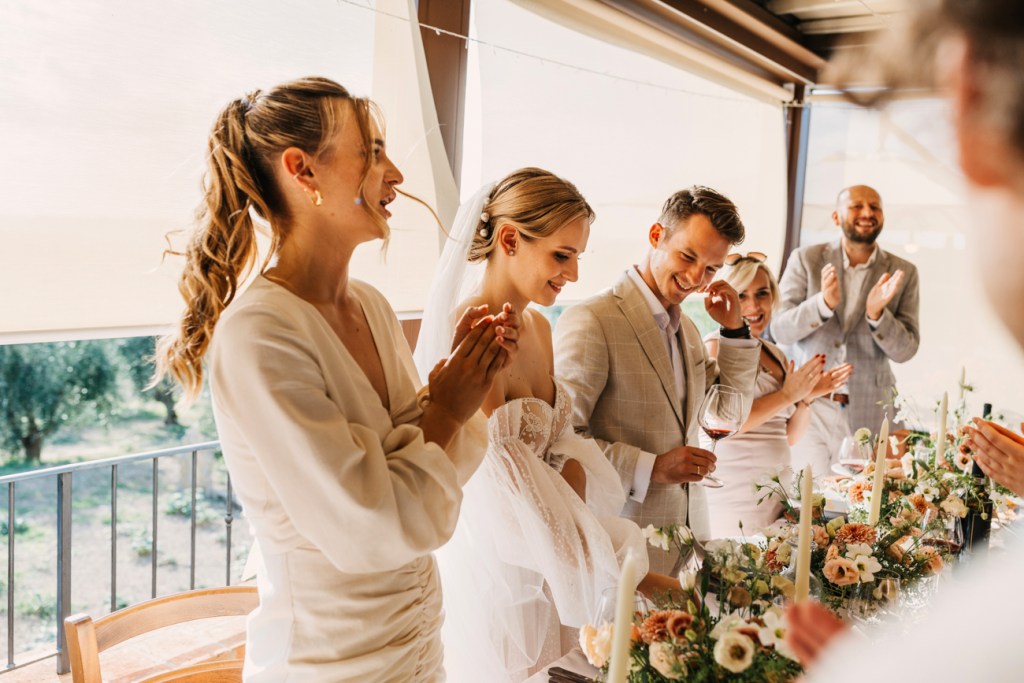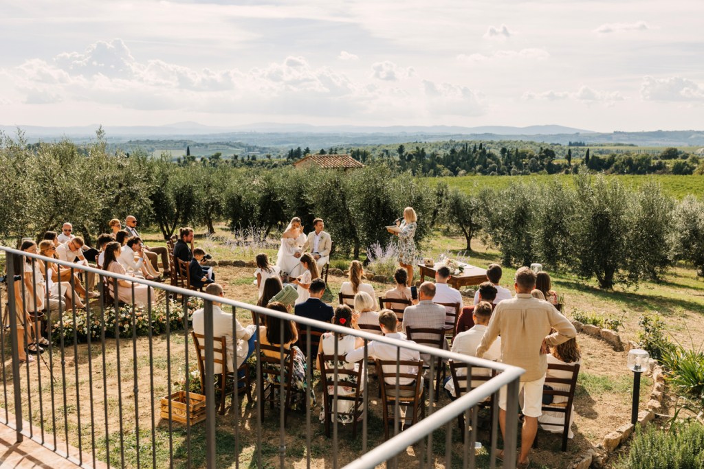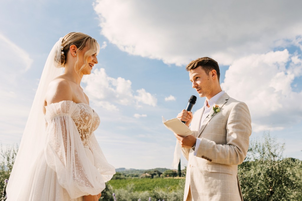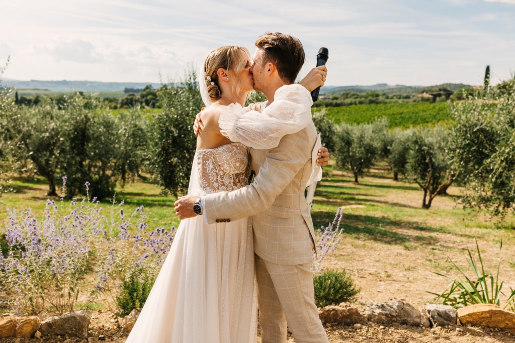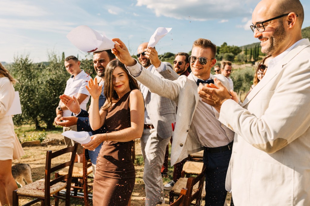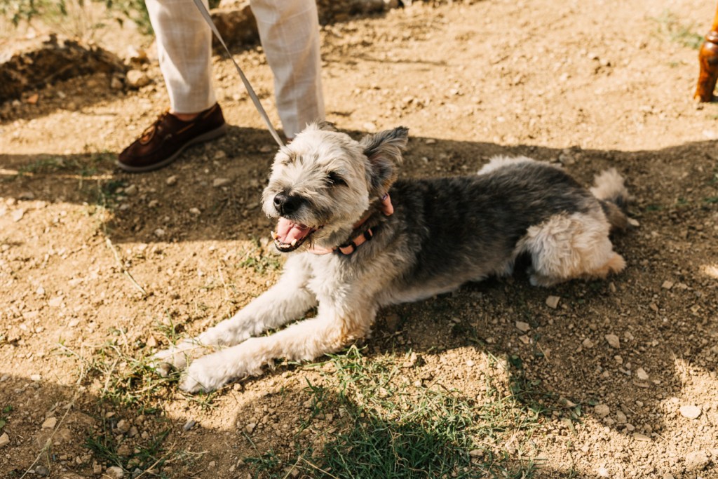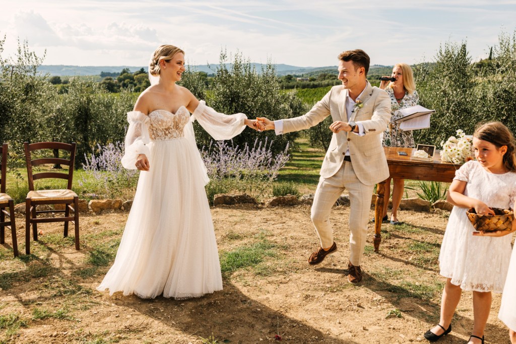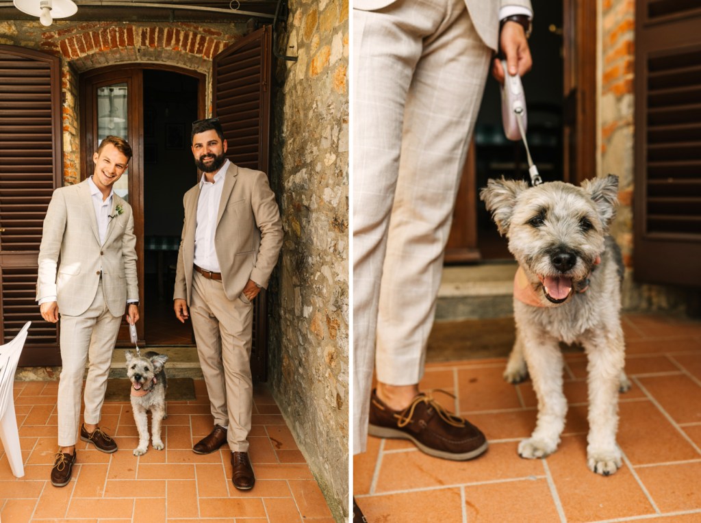 W tym samym czasie, gdy młodzi, przebierali się powoli w swoje ślubne stroje, goście mogli częstować się wybitnie dobrym winem, z którego Toskania słynie oraz próbować kolejnych włoskich regionalnych przysmaków, pod którymi uginały się stoły. A później nadszedł już czas ceremonii. Dominika i Marek postawili na plenerowy i humanistyczny ślub, który odbył się z widokiem na wspomniane już toskańskie wzgórza. Od początku podczas całej ceremonii dzielnie towarzyszył im Klopsik, stając się nieodłączną częścią tego ważnego dla nich dnia.