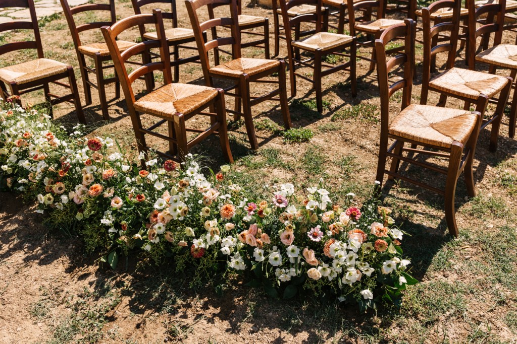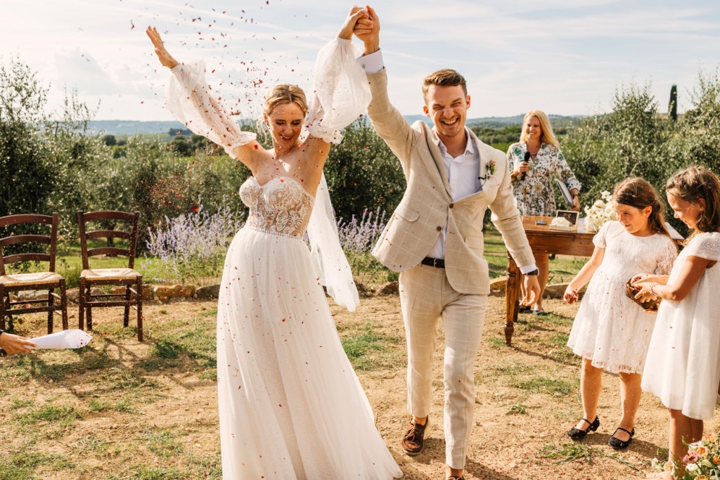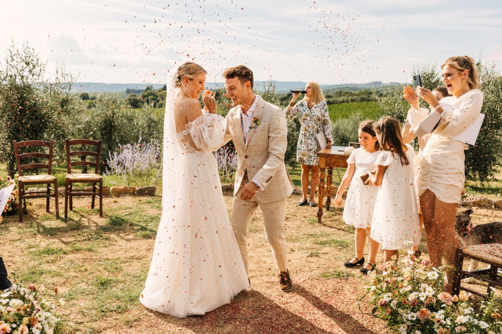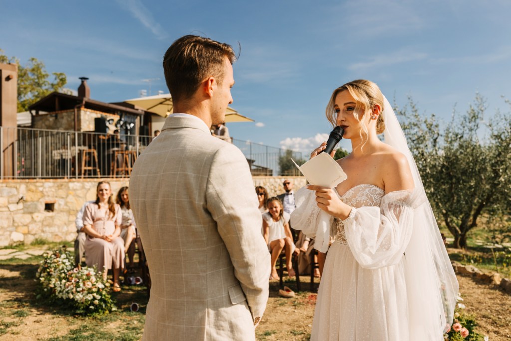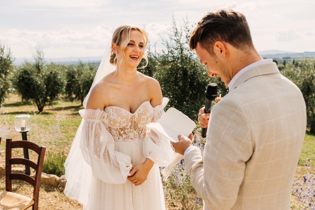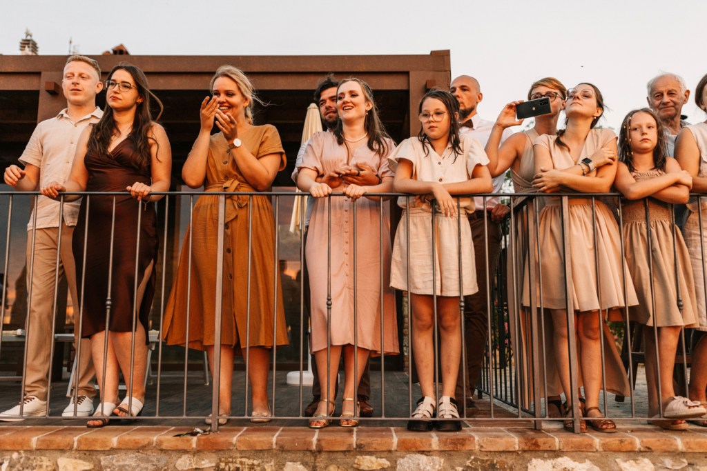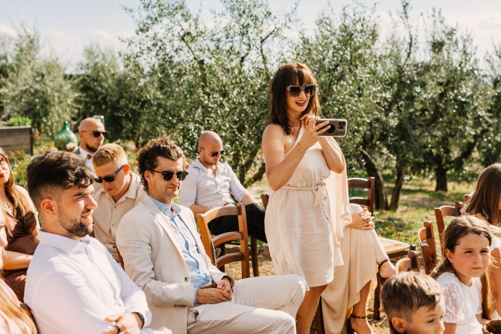 W tym samym czasie, gdy młodzi, przebierali się powoli w swoje ślubne stroje, goście mogli częstować się wybitnie dobrym winem, z którego Toskania słynie oraz próbować kolejnych włoskich regionalnych przysmaków, pod którymi uginały się stoły. A później nadszedł już czas ceremonii. Dominika i Marek postawili na plenerowy i humanistyczny ślub, który odbył się z widokiem na wspomniane już toskańskie wzgórza. Od początku podczas całej ceremonii dzielnie towarzyszył im Klopsik, stając się nieodłączną częścią tego ważnego dla nich dnia.
