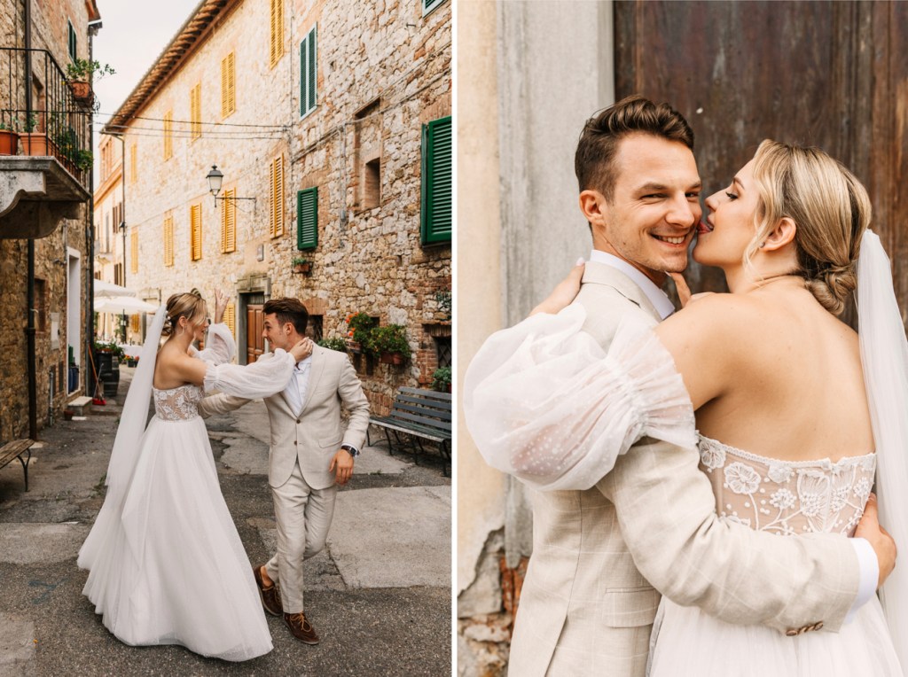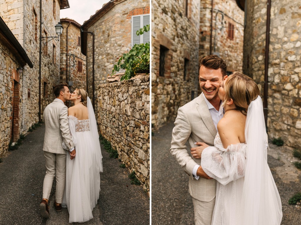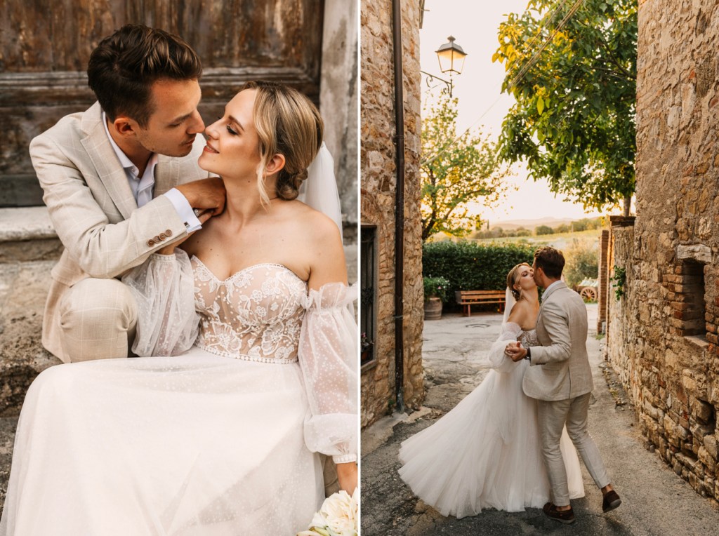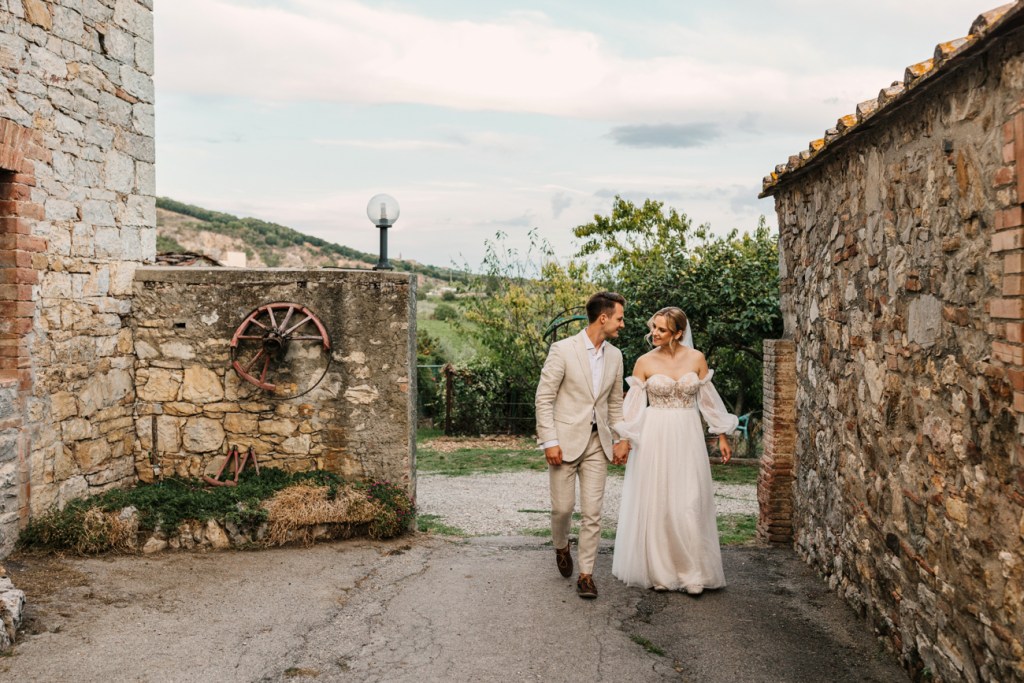 Ten cały włoski klimat ślubu w Toskanii ciężko porównać z żadnym innym miejscem, dlatego wiedziałem o tym, że muszę uchwycić podczas tego reportażu to, co w okolicy było najpiękniejsze. Na początku wybraliśmy się z Dominiką i Markiem do pobliskiego miasteczka, by pobłądzić nieco wśród tych wszystkich wąskich i kamiennych uliczek. Te piękne kameralne miejsca szybko zostały wypełnione niezwykłą energią moich młodych. Uwielbiam patrzeć na takie pary, które znają się tak dobrze, że nie czują przed sobą żadnego skrępowania. Ba! Nawet wzajemnie napędzają się tą energią, ciesząc się z każdej chwili i obdarowywując się wzajemnie czułościami.