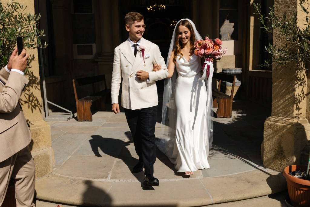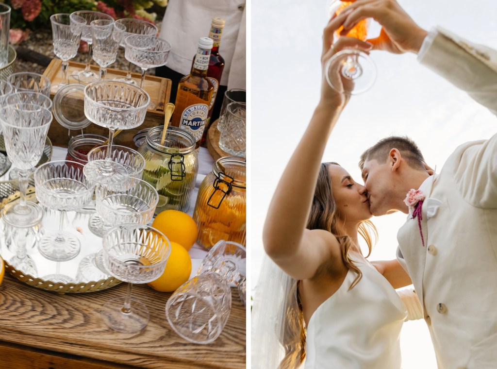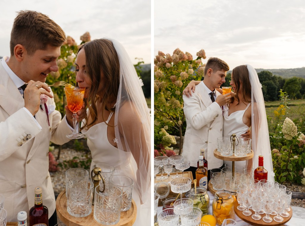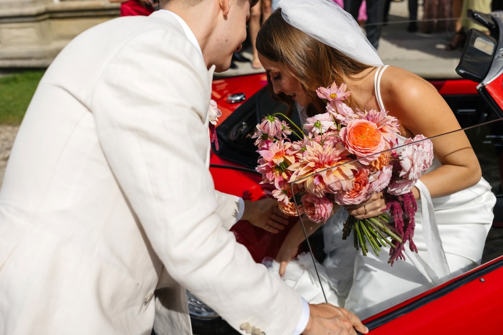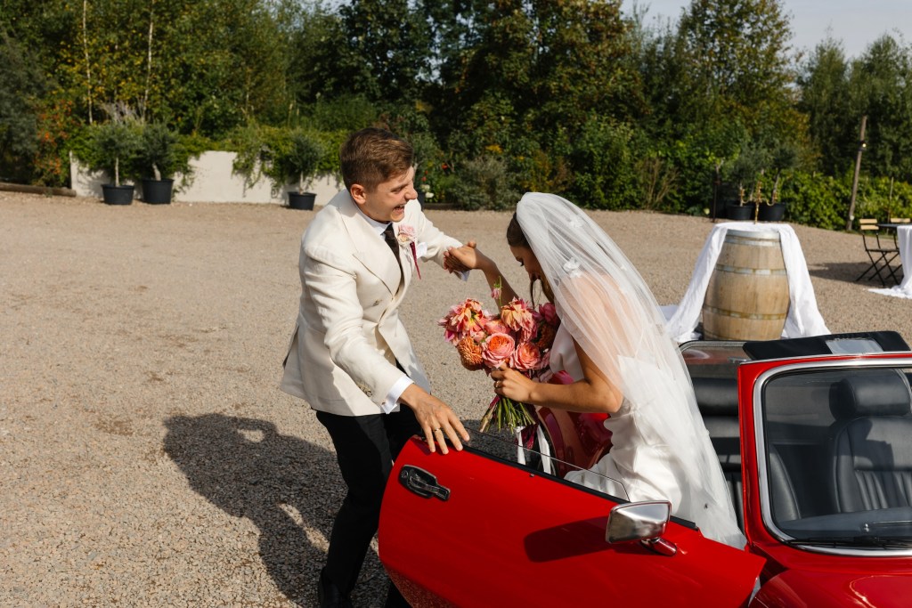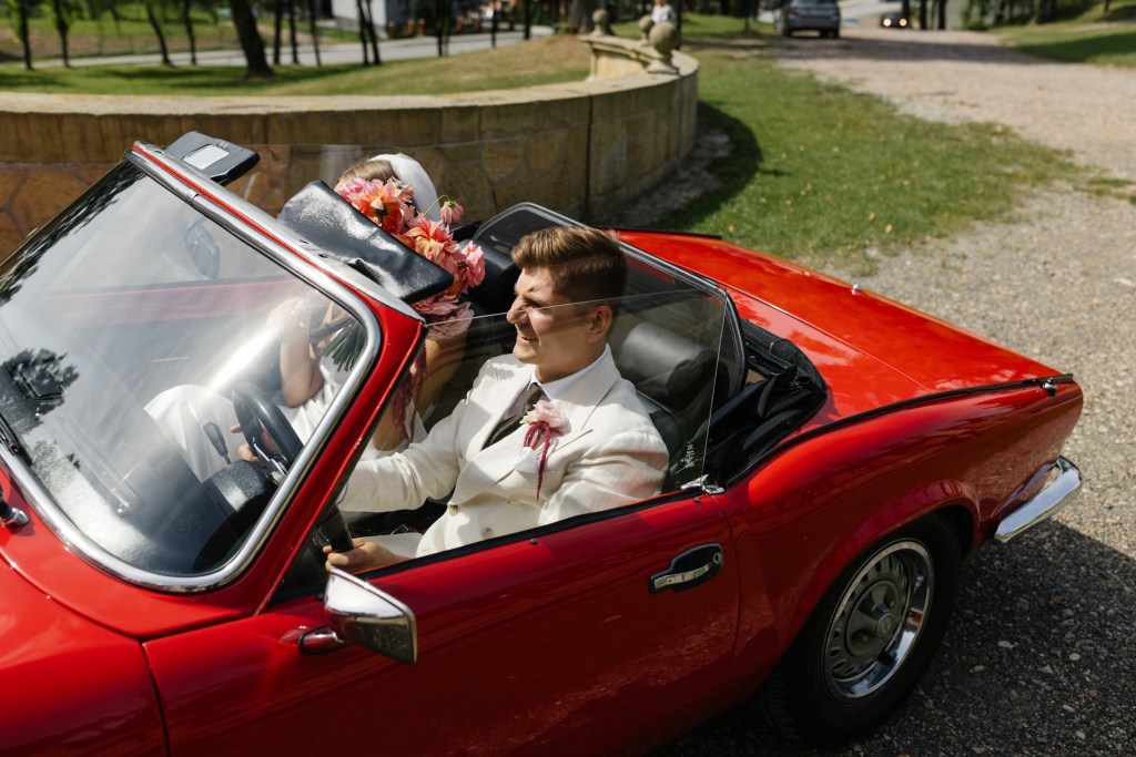 Na ślub jechali czerwonym kabrioletem Triumph, który idealnie wpasował się w klimat całego dnia — z klasą, z nutką retro, z oddechem wakacji. Adrian w białej marynarce wyglądał jak z włoskiego filmu, a Brygida w swojej zwiewnej, delikatnej sukni — jak ucieleśnienie letniej elegancji.