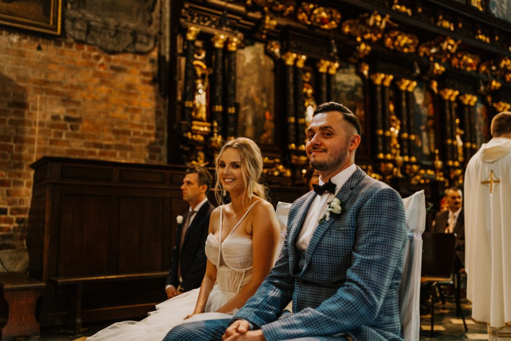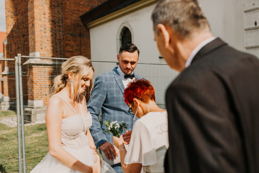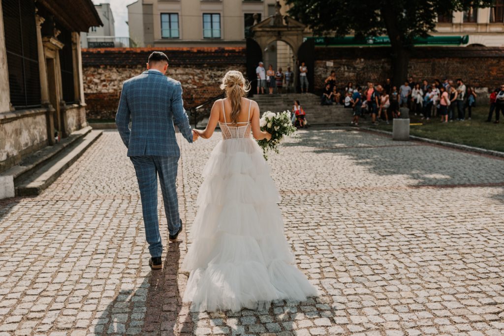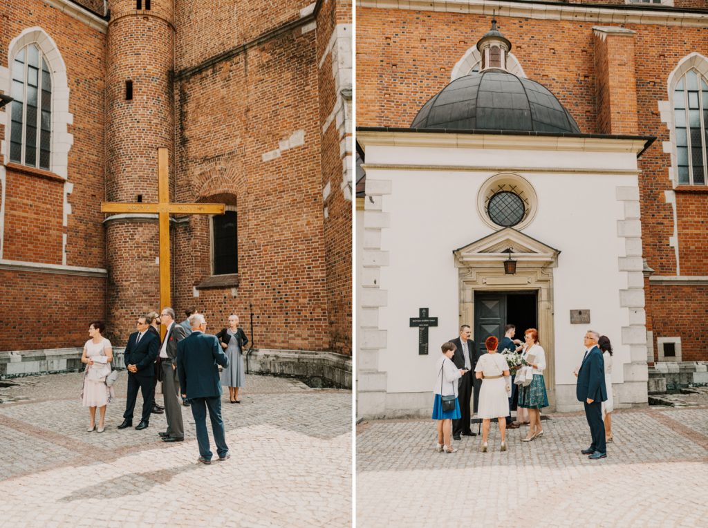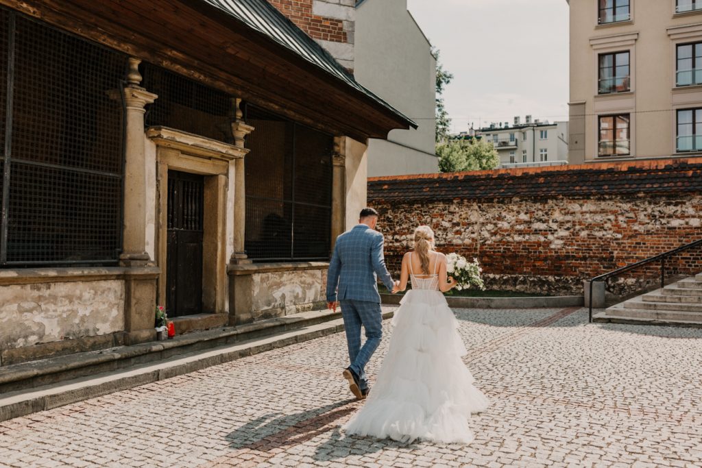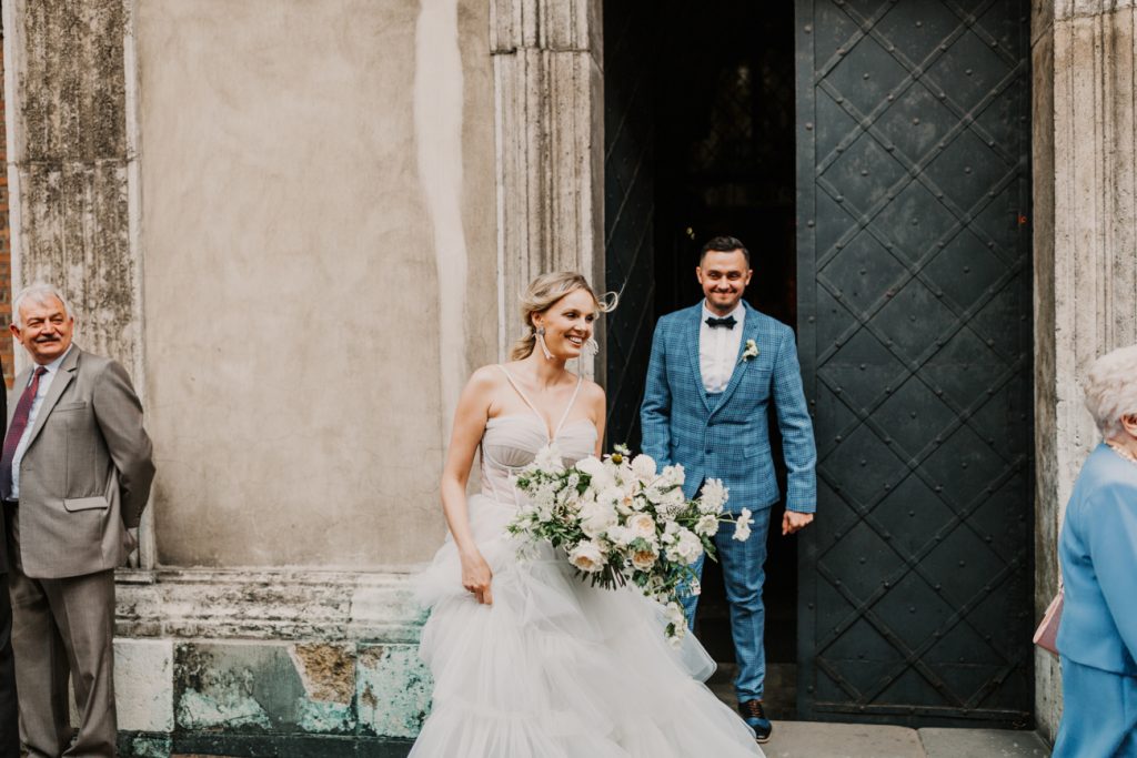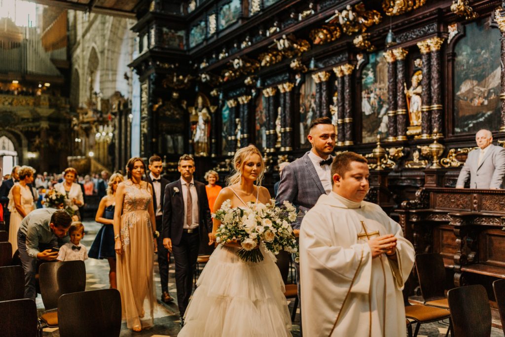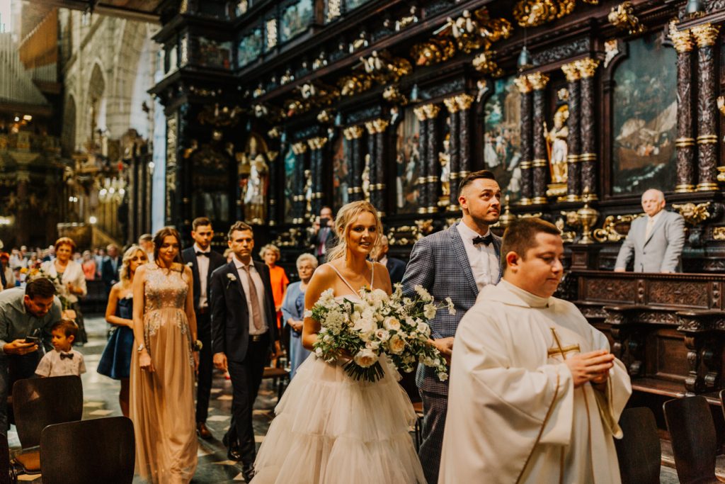 Ewa z Tomkiem nie zdecydowali się na zdjęcia z przygotowań, dlatego reportaż otwierają zdjęcia miejsca (lub venue, jak kto lubi), a następnie pojawiają się fotografie z ceremonii w pięknej bazylice Bożego Ciała w Krakowie. Znalazło się tez miejsce i czas na szybką mini sesje ślubną w zbożu (które niestety mogło trochę ucierpieć przez niezliczone sesje które miały tam miejsce tego lata).