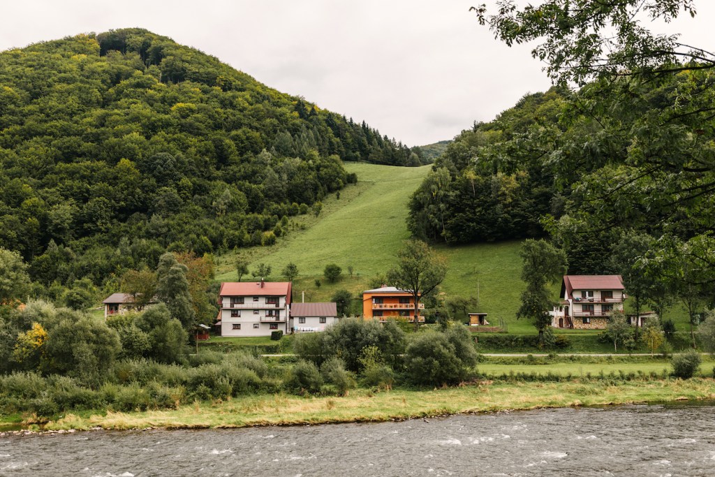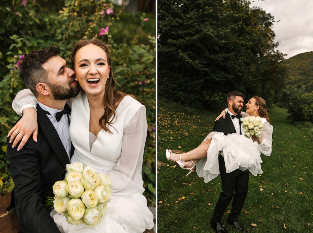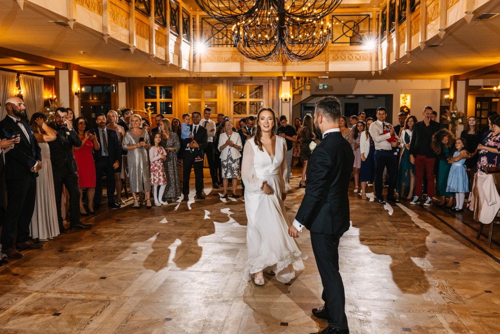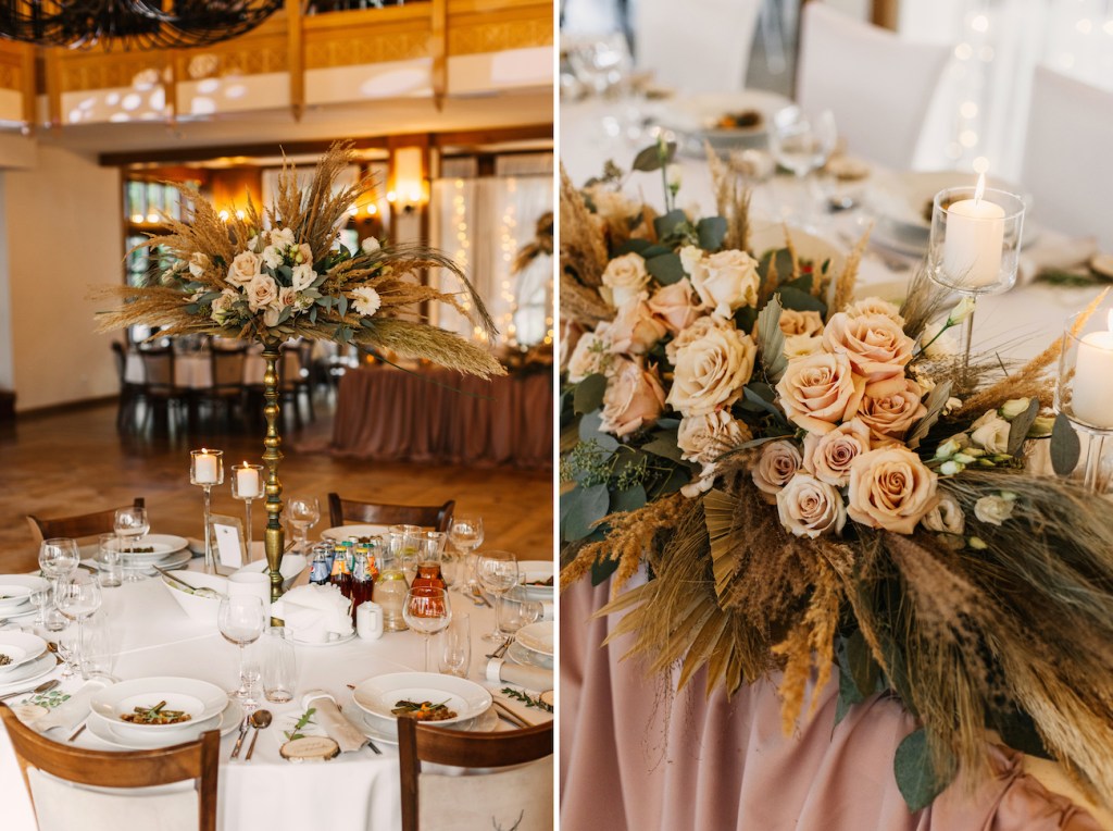Po ceremonii wyruszyliśmy do Willa Poprad, gdzie odbywało się przyjęcie. Piękna, dwupoziomowa sala z ogromnymi, pajęczymi żyrandolami udekorowana została bardzo gustownie, na stołach dominowała biel z lekko zgaszonym pudrowym różem i pięknymi kompozycjami róż i suszonych traw. Oprócz bajecznego umiejscowienia nad samą rzeką Poprad, miejsce to znane jest też z pysznego jedzenia, nawiązującego do kuchni międzywojnia. Goście mieli okazję przekonać się sami o wyjątkowości tej kuchni podczas uroczystego obiadu, do którego mieli szansę usiąść chwilę po złożeniu życzeń. A później nadszedł czas na widowiskowy i niezwykle elegancki pierwszy taniec, który otworzył – już oficjalnie – zabawę na przyjęciu weselnym. Do Willa Poprad warto wybrać się nawet bez okazji, aby poznać tutejsze atrakcje i pospacerować wśród tych bajecznych krajobrazów. Co zresztą mieliśmy możliwość uczynić przy okazji sesji naszej pary młodej, na którą wyrwaliśmy się chwilę po pierwszym tańcu. Państwo Młodzi swoją naturalnością, idealnie wpisali się w zielony krajobraz tego miejsca. Czuli się zupełnie swobodnie, w pełni oddając się i skupiając na sobie, nie szczędząc sobie przy tym czułości, a ja mogłem – równie swobodnie – grać rolę cichego obserwatora, skrzętnie dokumentującego te chwile. Czy się udało? Z taką parą nie mogło się nie udać.