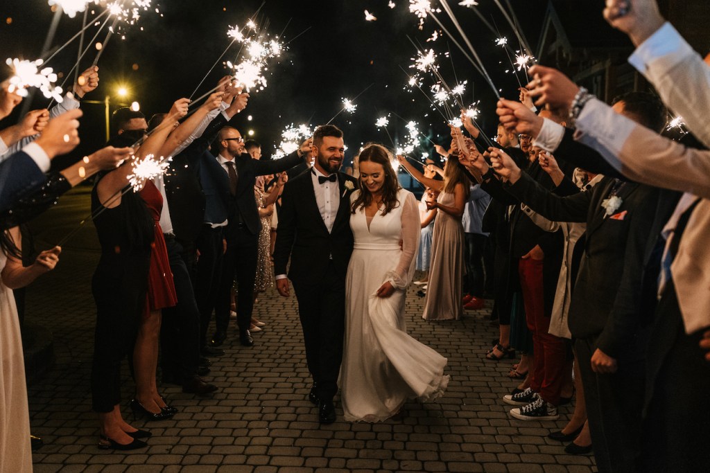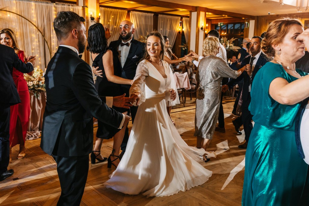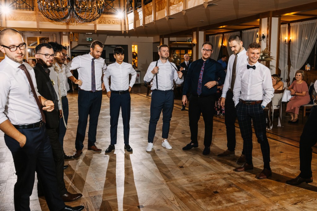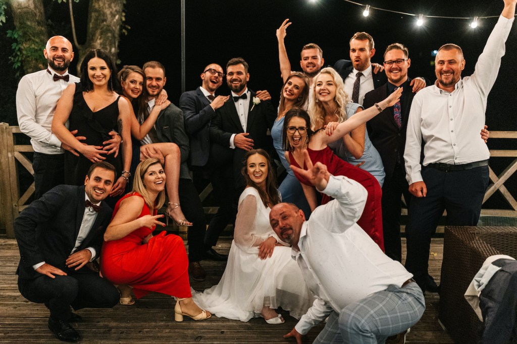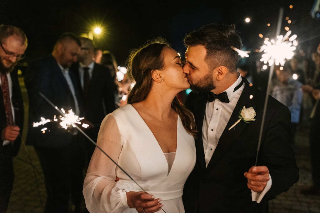 Często jest tak, że przyciągamy w życiu podobne do siebie osoby. I ta teza w pełni sprawdza się w przypadku Oli i Mateusza. Ich goście… To był istny ogień! Zabawy, rekwizyty i – jak u państwa młodych – totalna naturalność i zero skrępowania aparatem. Nie pamiętam, kiedy ostatnim razem miałem tak wiele doskonałych zdjęć! Niektórzy z nich potrafili spędzić na nim spooooro czasu bez konieczności przerwy. A to oznacza tylko jedno: było naprawdę, naprawdę dobrze. Szaleństwo na parkiecie, którym zawładnęli w pełni, po dłuższej chwili przeniosło się na oświetlony już taras, gdzie wszyscy ochoczo pozowali do swoich zabawnych zdjęć z młodymi w roli głównej. Znaleźliśmy jednak jeszcze chwilę na to, by uchwycić Olę i Mateusza samych w świetle rozwieszonych na całym tarasie lampek, które rzucały ciepłe światło, na i tak już jasno bijące od nich ciepło. Zrobiliśmy też krótką sesję, angażując gości do roztoczenia wokół nich punktowych świateł z zimnych ogni.