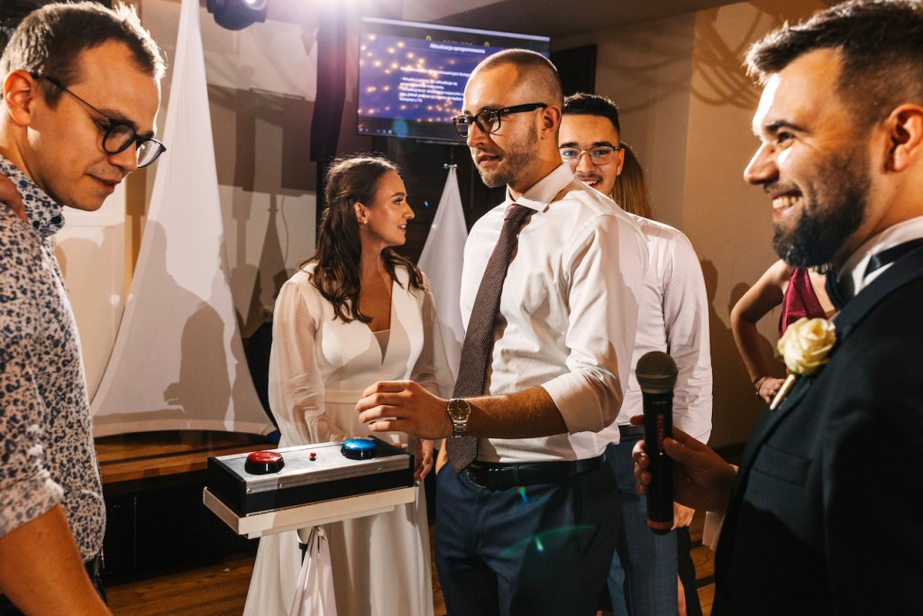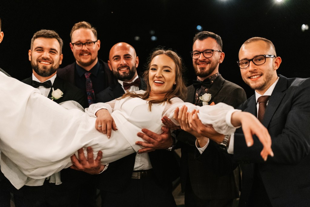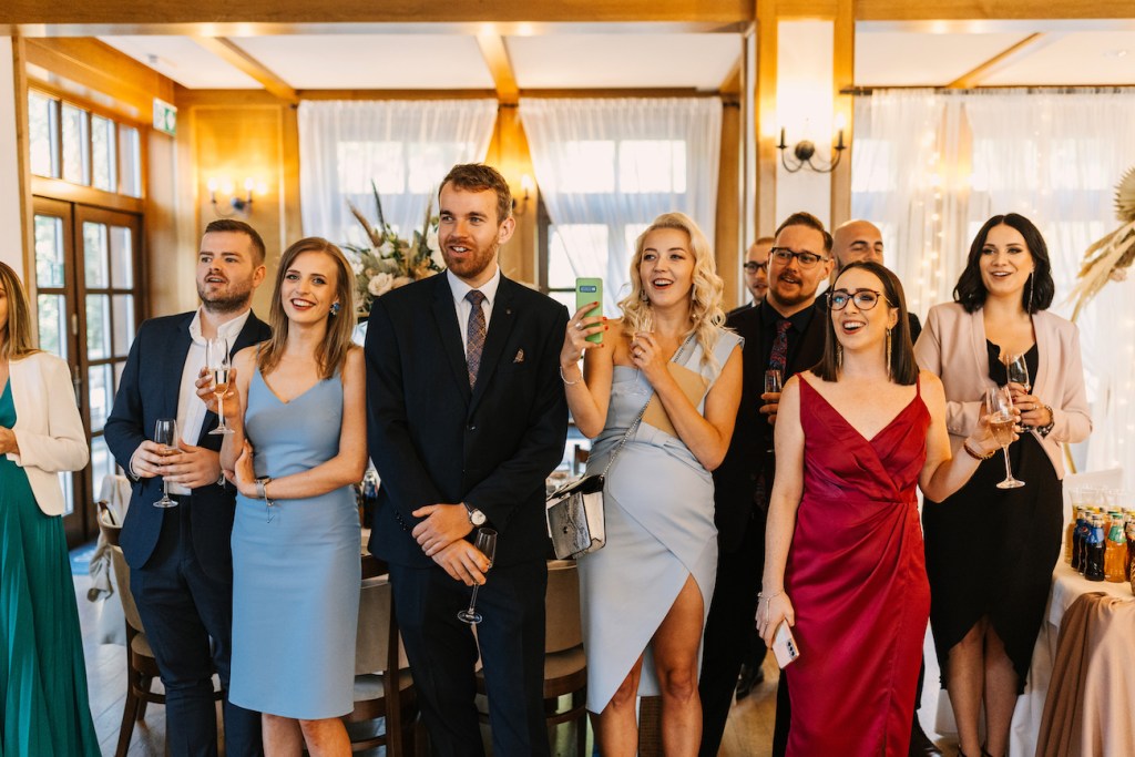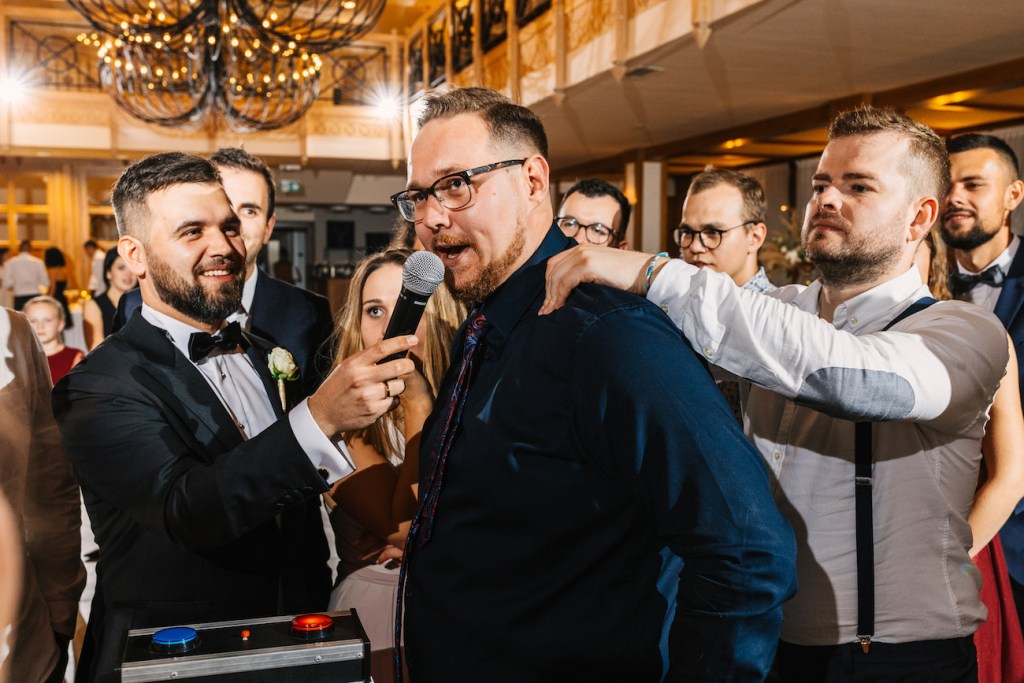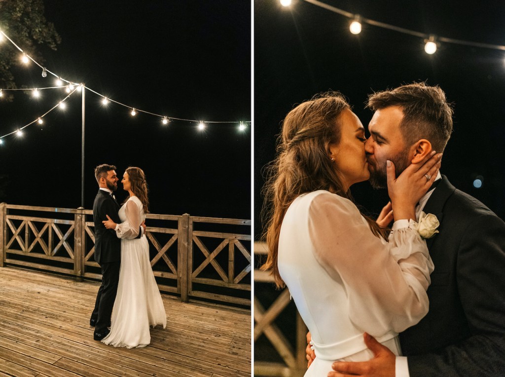 Często jest tak, że przyciągamy w życiu podobne do siebie osoby. I ta teza w pełni sprawdza się w przypadku Oli i Mateusza. Ich goście… To był istny ogień! Zabawy, rekwizyty i – jak u państwa młodych – totalna naturalność i zero skrępowania aparatem. Nie pamiętam, kiedy ostatnim razem miałem tak wiele doskonałych zdjęć! Niektórzy z nich potrafili spędzić na nim spooooro czasu bez konieczności przerwy. A to oznacza tylko jedno: było naprawdę, naprawdę dobrze. Szaleństwo na parkiecie, którym zawładnęli w pełni, po dłuższej chwili przeniosło się na oświetlony już taras, gdzie wszyscy ochoczo pozowali do swoich zabawnych zdjęć z młodymi w roli głównej. Znaleźliśmy jednak jeszcze chwilę na to, by uchwycić Olę i Mateusza samych w świetle rozwieszonych na całym tarasie lampek, które rzucały ciepłe światło, na i tak już jasno bijące od nich ciepło. Zrobiliśmy też krótką sesję, angażując gości do roztoczenia wokół nich punktowych świateł z zimnych ogni.