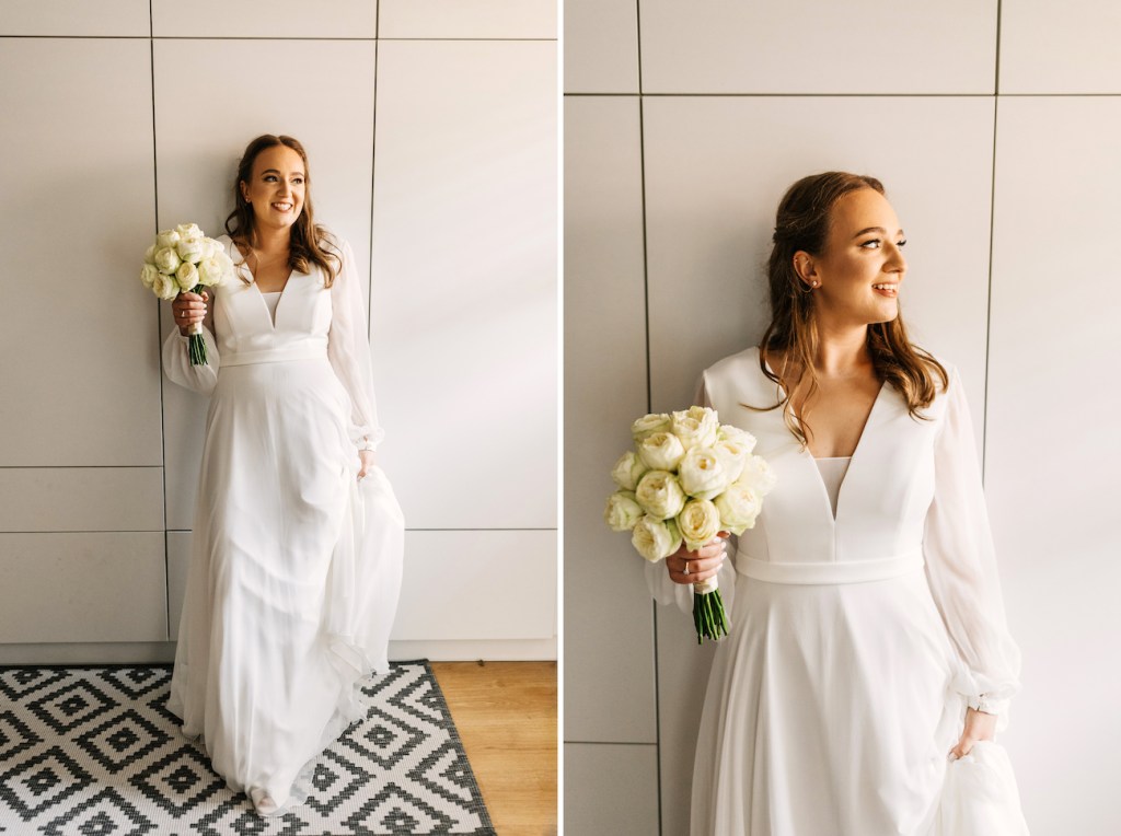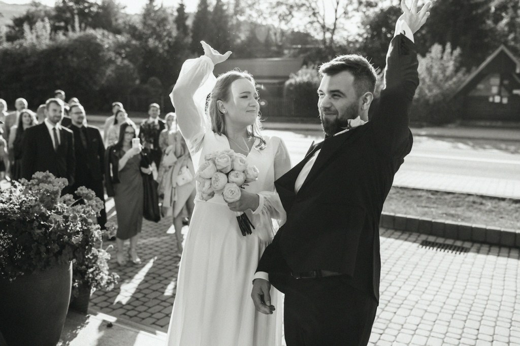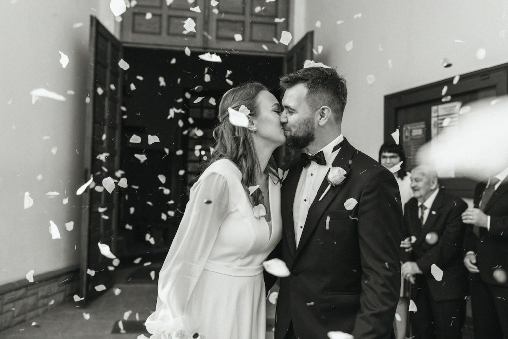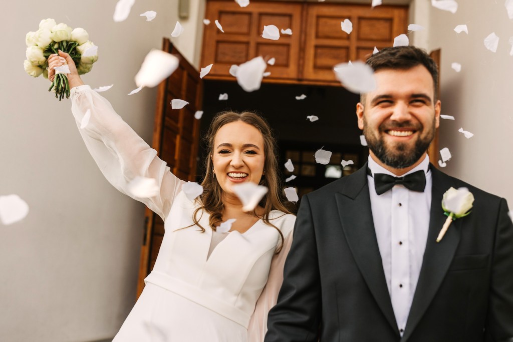 Z perspektywy fotografa: wyjście z kościoła jest jednym z najbardziej fotogenicznych momentów, w jakich można uchwycić parę młodą. Sami wiecie: szczęście, ulga i poczucie wygranej uchwycone w jednej chwili – takie kompilacje nie zdarzają się często. Dlatego zawsze sugeruje, jak cały ten moment jeszcze bardziej uatrakcyjnić, uczynić jeszcze bardziej fotogenicznym. I tutaj naprawdę świetną rolę pełnią płatki kwiatów, które niczym naturalne confetti, pięknie dopełniają cały obraz.