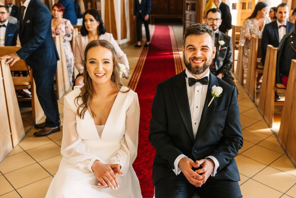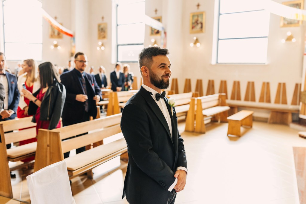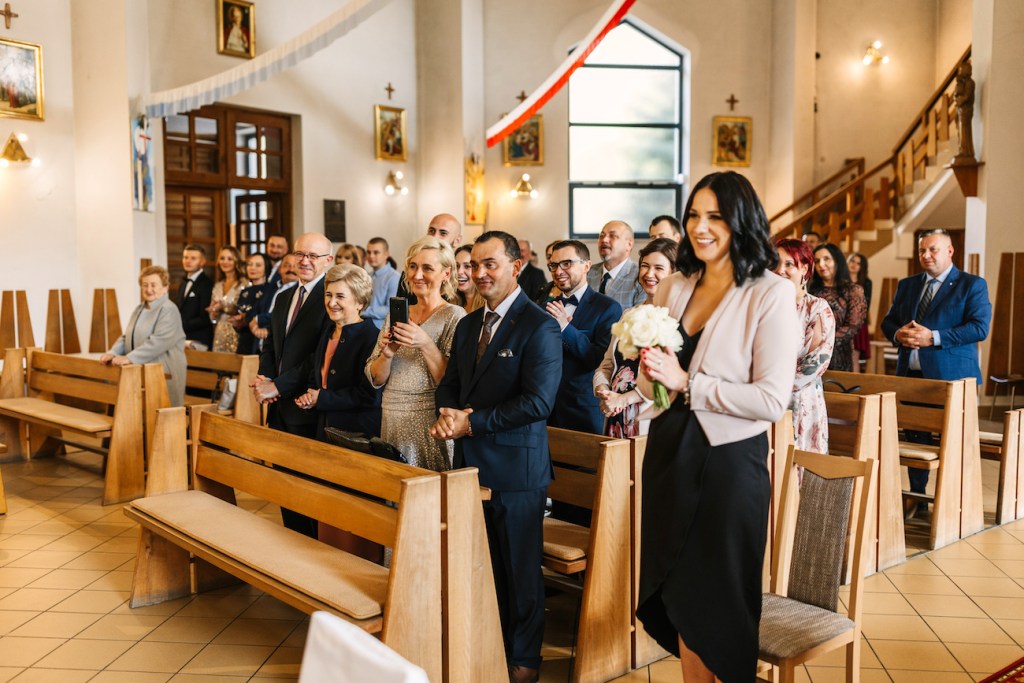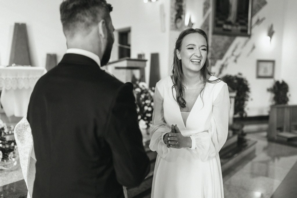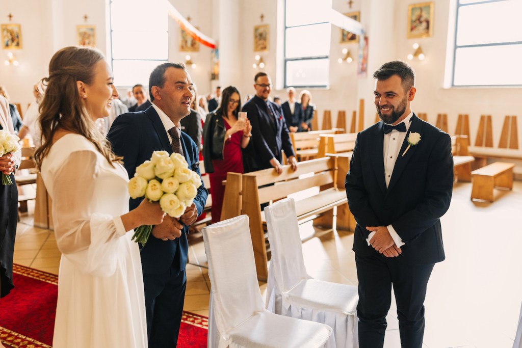 Ola, prowadzona przez swojego tatę do ołtarza, skupiła na sobie uwagę wszystkich zebranych. Jednak ten, który patrzył na nią z największym zachwytem czekał już przy ołtarzu. Przez całą ceremonię uśmiech nie schodził z twarzy Oli i Mateusza. To jedna z rzeczy, którą uwielbiam w pracy fotografa ślubnego. Podczas ślubu: nikt nie sili się na udawanie, pozowanie czy powstrzymywanie się przed czymkolwiek. Wszystko, co widzicie na zdjęciach to prawdziwe emocje, uchwycone chwile, które w pamięci młodych zostaną na zawsze. Niektóre pewnie też w anegdotach, które przez kolejne lata będą do nich wracać przy wspominaniu tych dni. I jestem przekonany, że jedną z nich będzie wspomnienie wzruszenia Oli, która (wciąż!) z uśmiechem na twarzy, pozwoliła na pokazanie łez wzruszenia podczas składania przysięgi. Co zresztą udzieliło się zgromadzonym w kościele, którzy po kryjomu podawali sobie wzajemnie chusteczki w kościelnych ławkach.