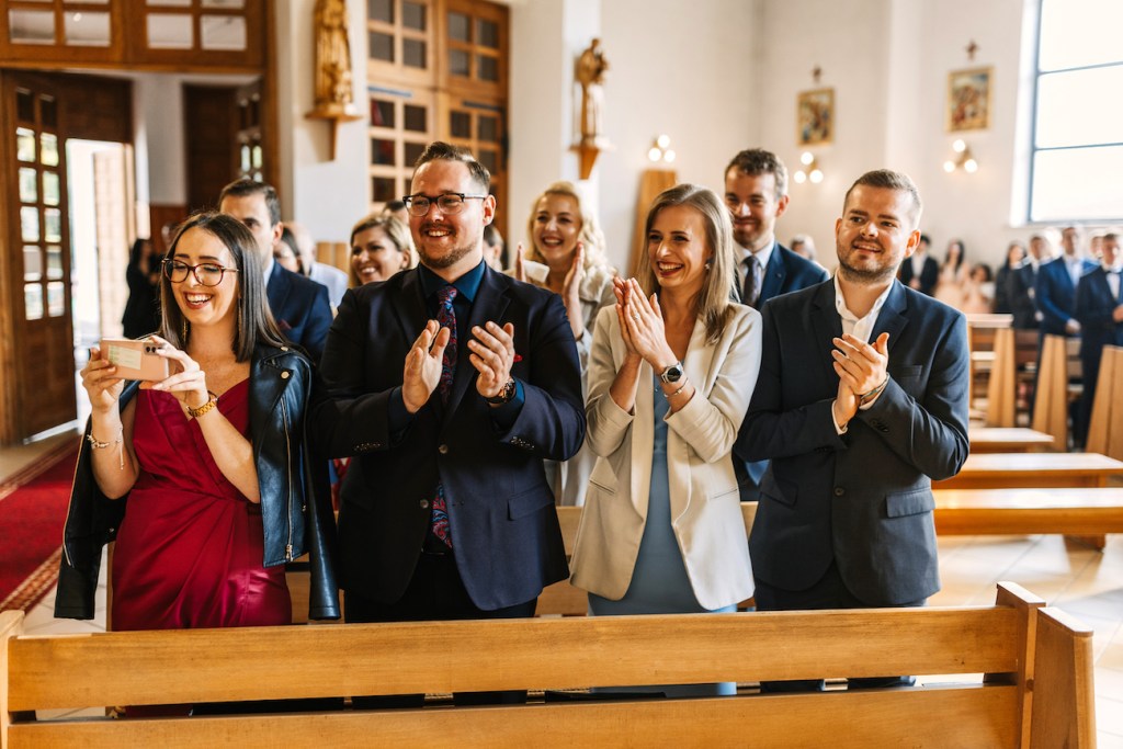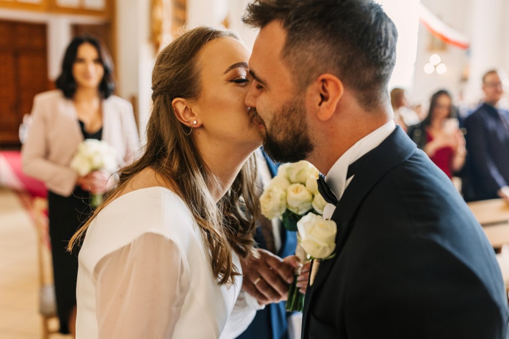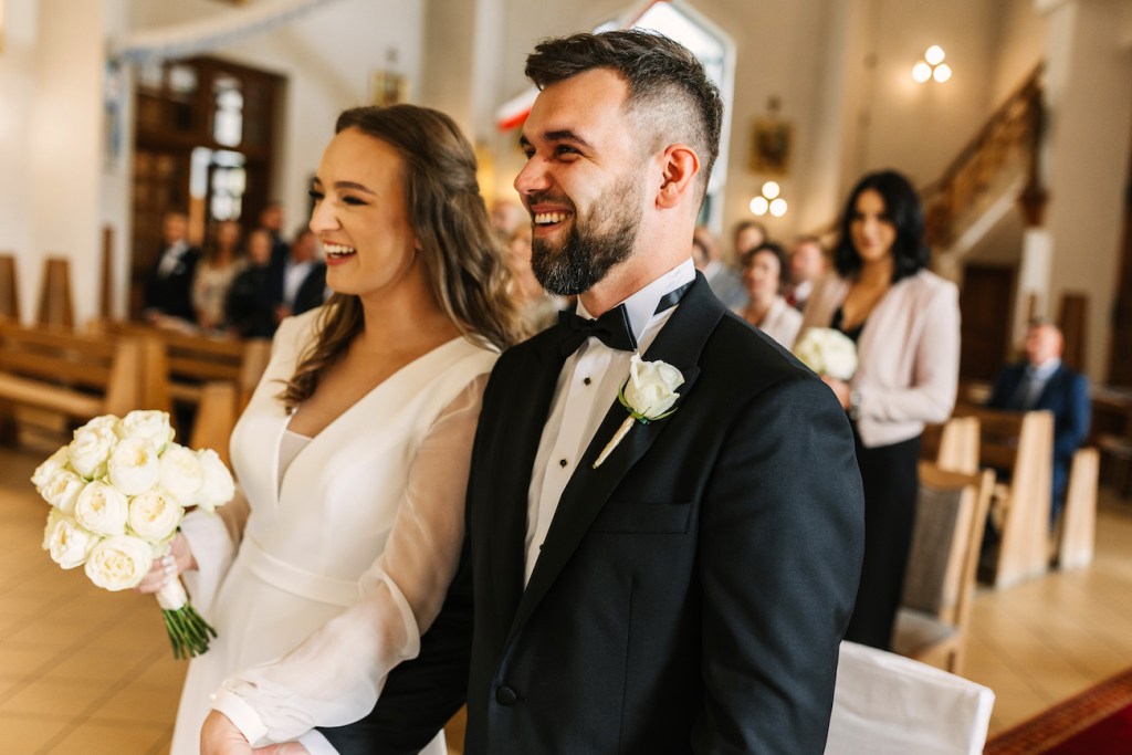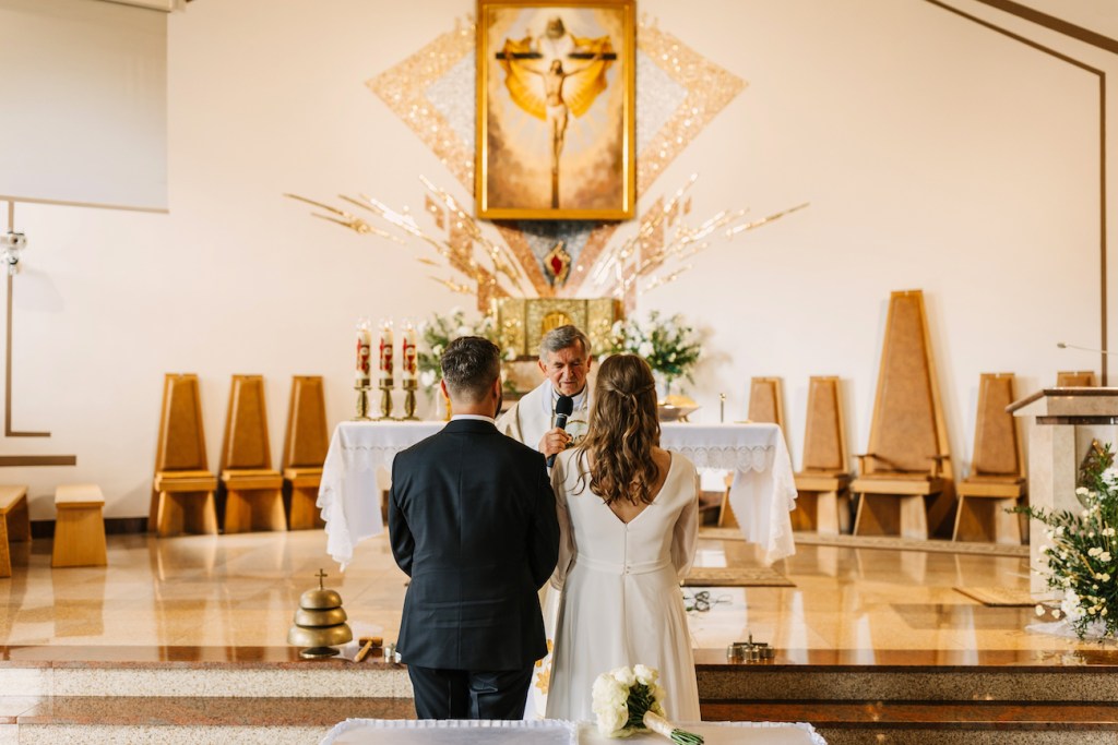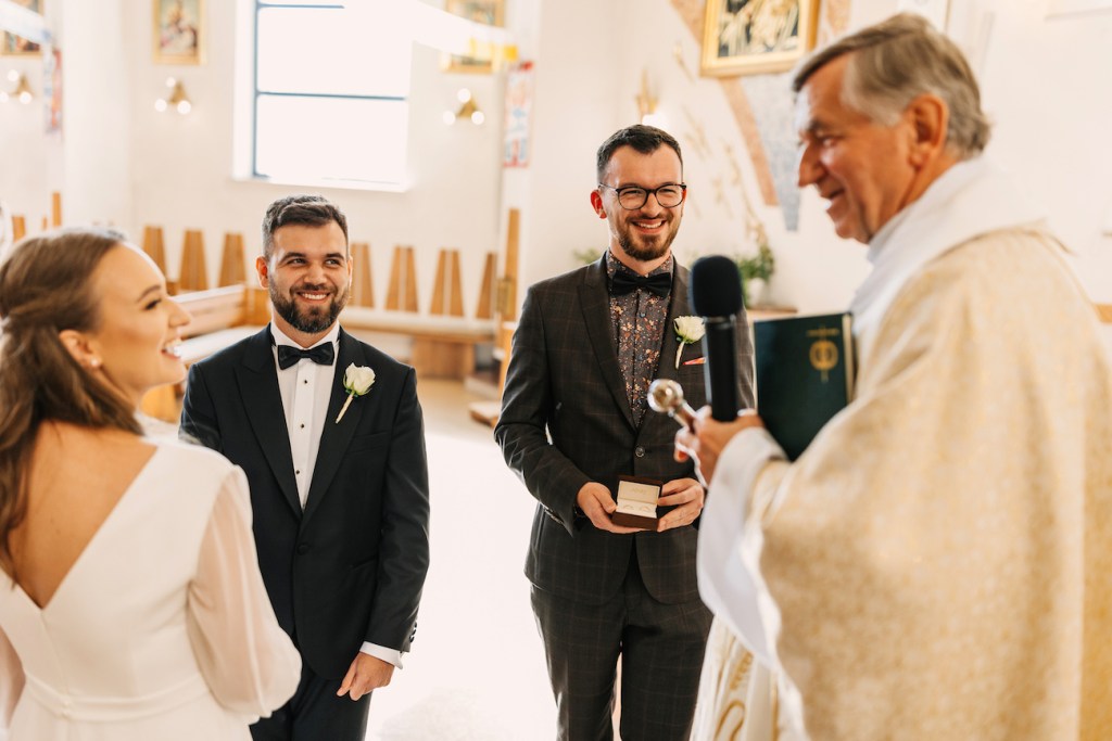 Ola, prowadzona przez swojego tatę do ołtarza, skupiła na sobie uwagę wszystkich zebranych. Jednak ten, który patrzył na nią z największym zachwytem czekał już przy ołtarzu. Przez całą ceremonię uśmiech nie schodził z twarzy Oli i Mateusza. To jedna z rzeczy, którą uwielbiam w pracy fotografa ślubnego. Podczas ślubu: nikt nie sili się na udawanie, pozowanie czy powstrzymywanie się przed czymkolwiek. Wszystko, co widzicie na zdjęciach to prawdziwe emocje, uchwycone chwile, które w pamięci młodych zostaną na zawsze. Niektóre pewnie też w anegdotach, które przez kolejne lata będą do nich wracać przy wspominaniu tych dni. I jestem przekonany, że jedną z nich będzie wspomnienie wzruszenia Oli, która (wciąż!) z uśmiechem na twarzy, pozwoliła na pokazanie łez wzruszenia podczas składania przysięgi. Co zresztą udzieliło się zgromadzonym w kościele, którzy po kryjomu podawali sobie wzajemnie chusteczki w kościelnych ławkach.